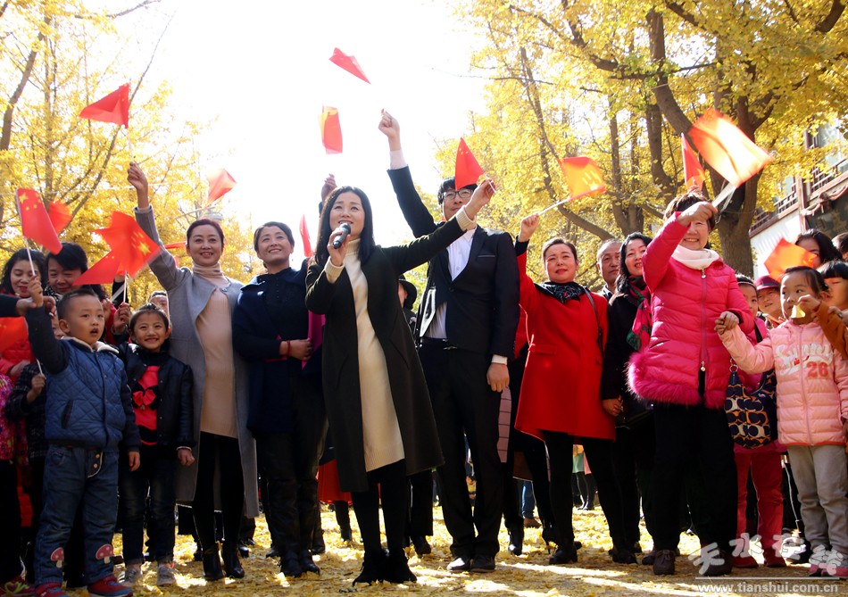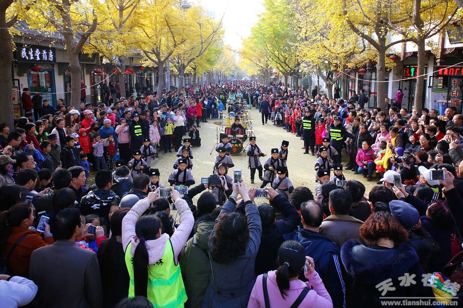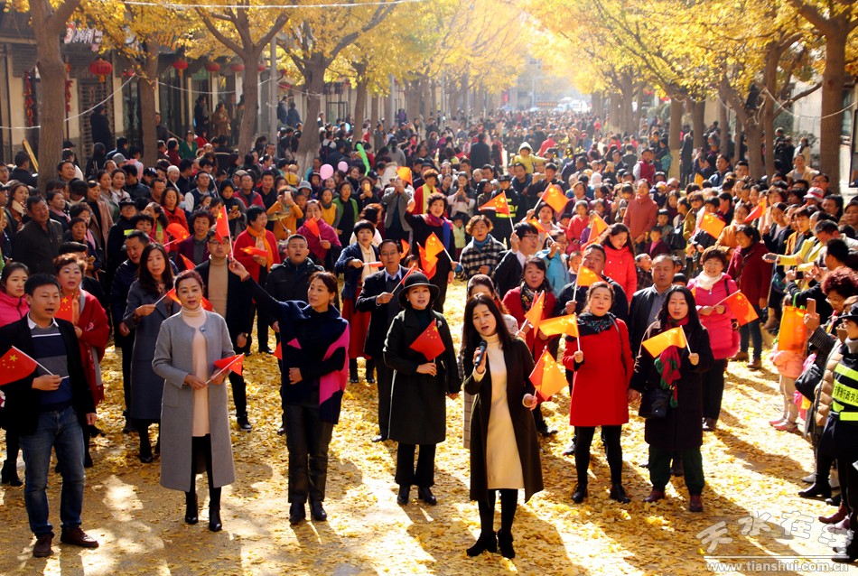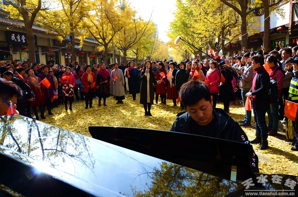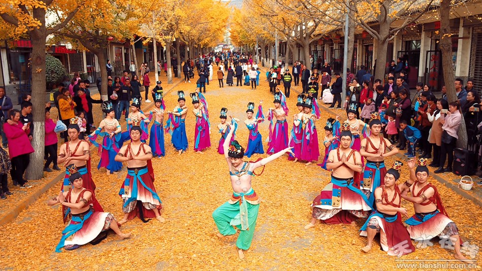 “瑞云缥缈衣带流,仙乐自鸣花雨飞。”天水市歌舞团11月11日在“黄金大道”上将《天女散花》这个人间口口相传的神话故事动情演绎。不仅如此,“快闪”合唱《我爱你,中国》、幼儿国学、少儿武术、古筝表演、《四大名著》合唱等一系列展演活动在这三天内将“黄金大道”的狂欢一次次推向高潮。金黄街道上色彩鲜艳的表演者,涌动而欢闹的人群,成为寒意渐浓的初冬里最温暖的一簇火苗。与此同时,街道上的年轻人有的在跳街舞,有的扮演孙悟空在街道上行走,更多的是通过互联网将每一个精彩瞬间分享到世界各地。几位从西安徒步去伊斯坦布尔丈量古丝绸之路的美国游客专程赶来参与狂欢,他们说道:“印象中的中国人都很内敛,没想到在这里还能感受一次狂欢节,看到这么多从来没见过的表演,太新鲜了!”