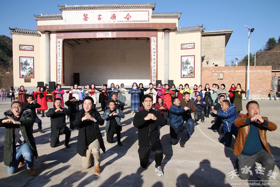 (在村文化广场排演《苦乐村官》主题曲《小康不小康,关键看老乡》快闪大合唱。)