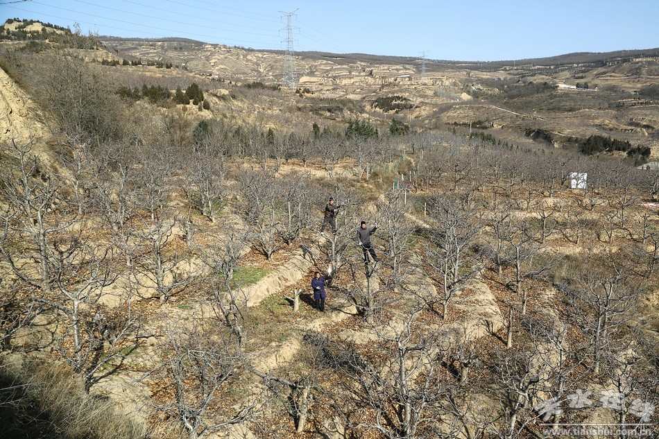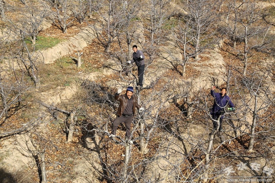 12月16日,天水市秦州区玉泉镇烟铺村的果农正在为樱桃树剪枝。烟铺村是一个现有176户800余口人的古老村落,这里属典型的半湿润半干旱温带气候,四季雨量适中,日照充沛,土层深厚,是种植大樱桃的最佳生长区域,自实施退耕还林以来,大樱桃种植成了该村唯一的支柱产业和收入来源。截止目前,区域内已栽培红灯、美早等樱桃品种23个1483亩。天水籍中央电视台《中华情》总导演郭霁红是烟铺大樱桃的公益代言人。