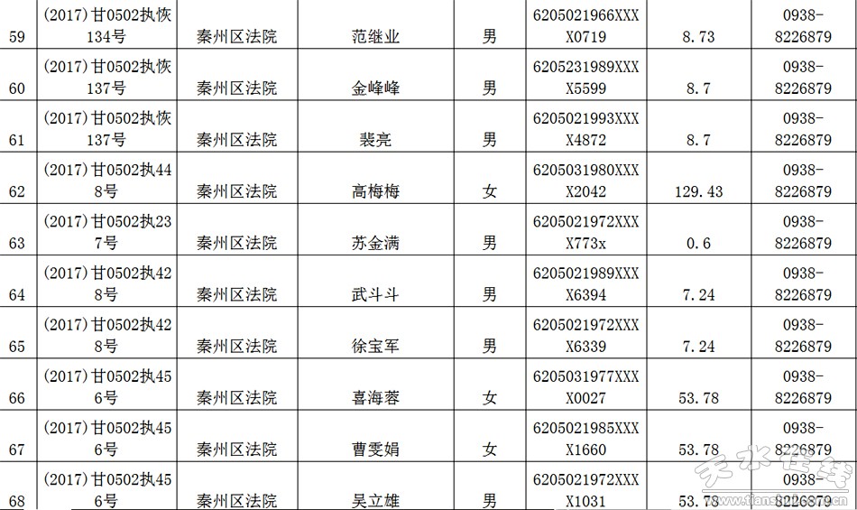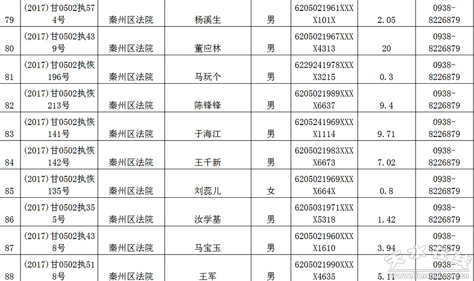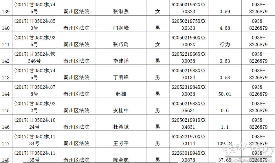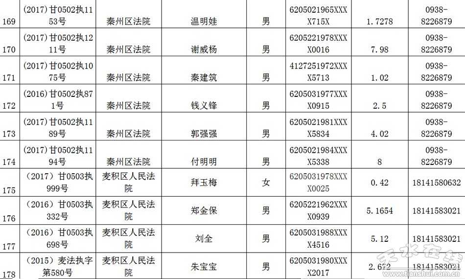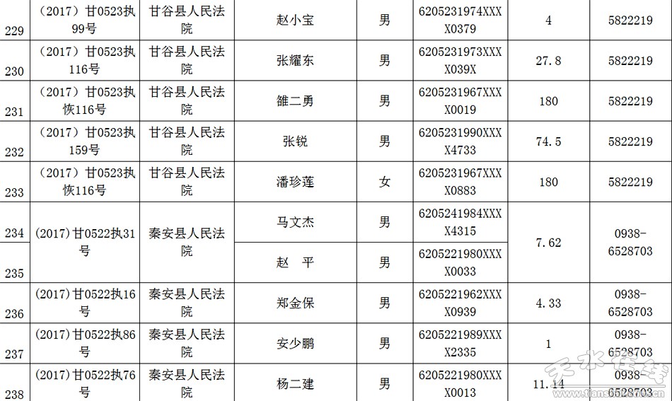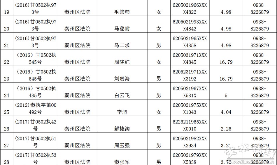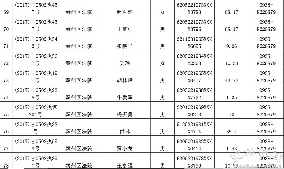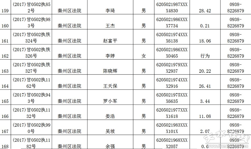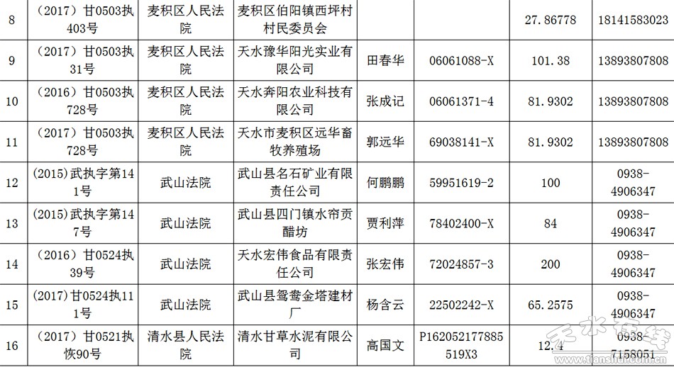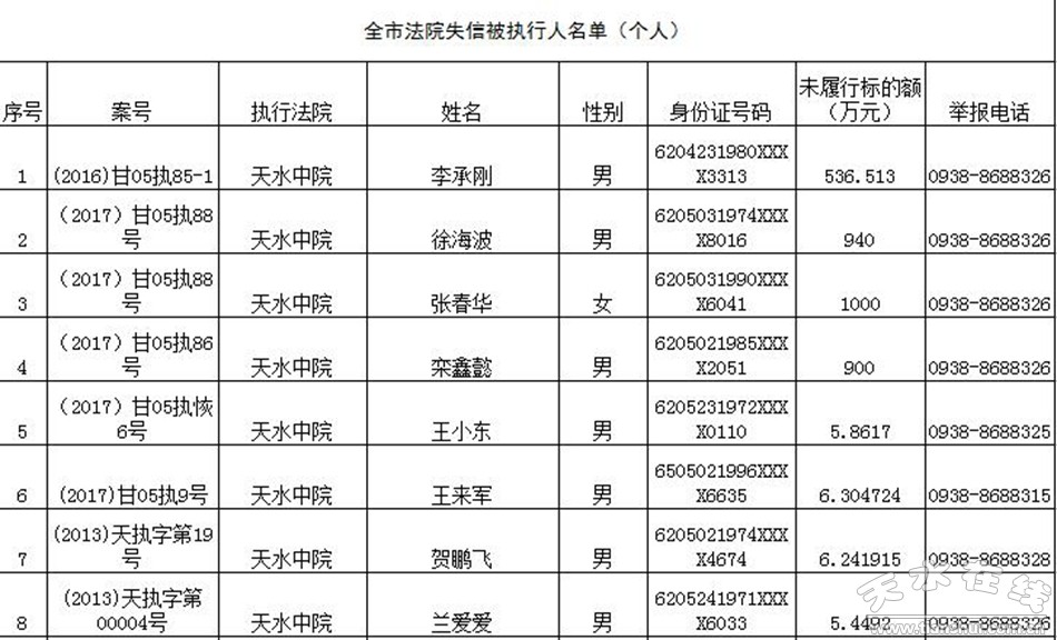 天水市中级人民法院关于公布失信被执行人名单的公告