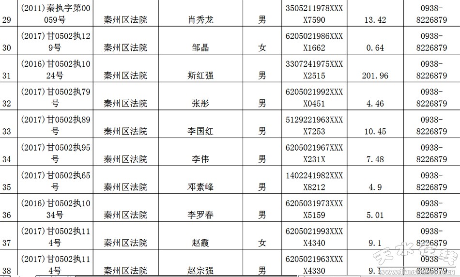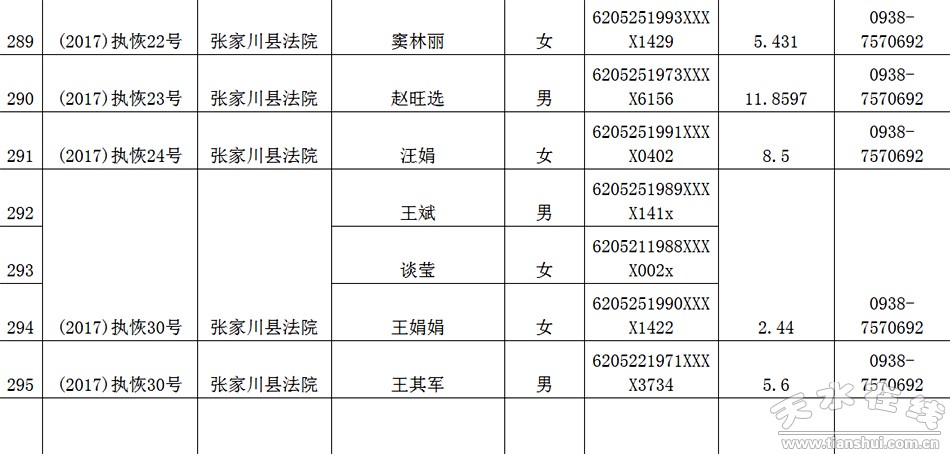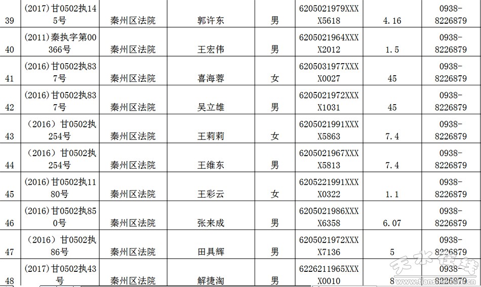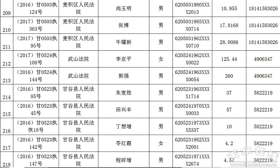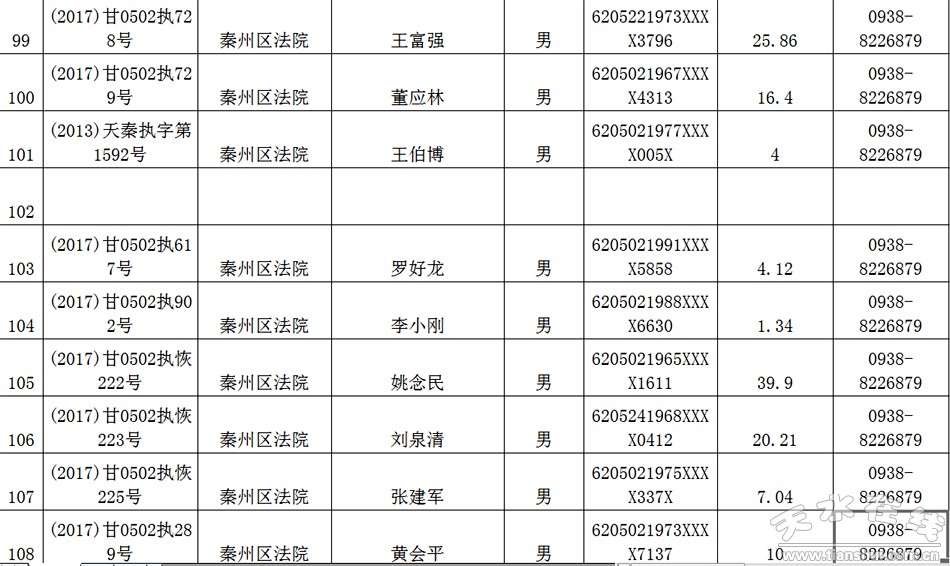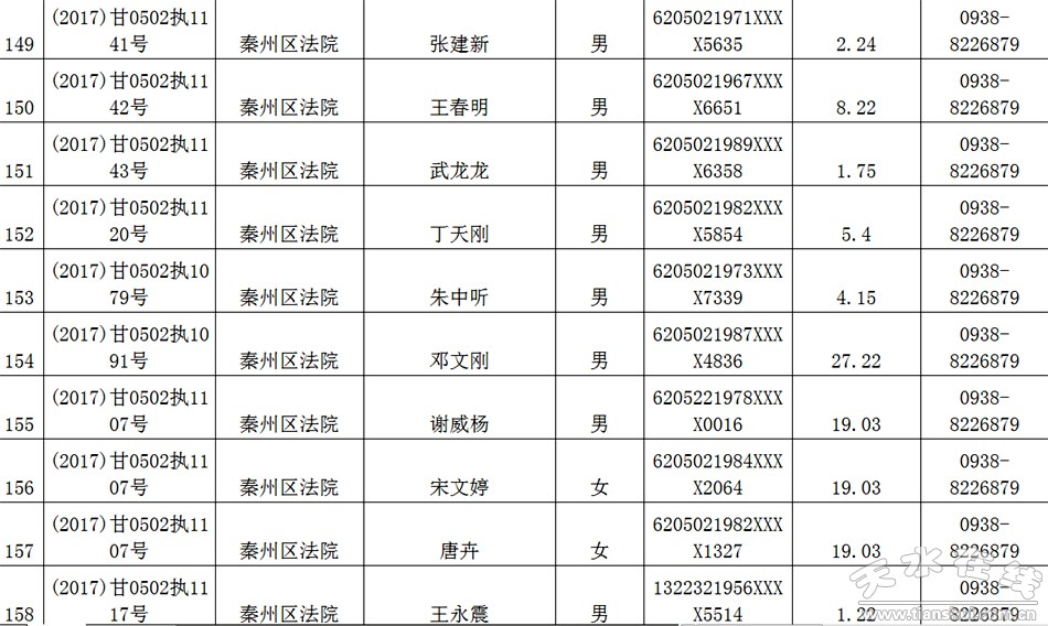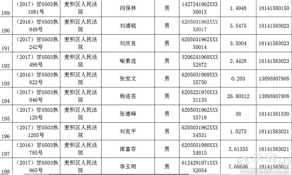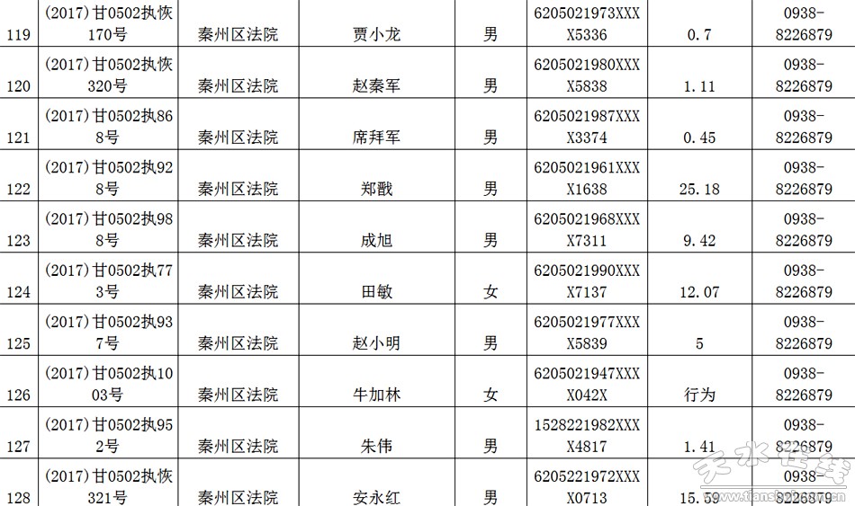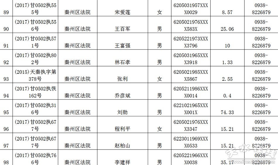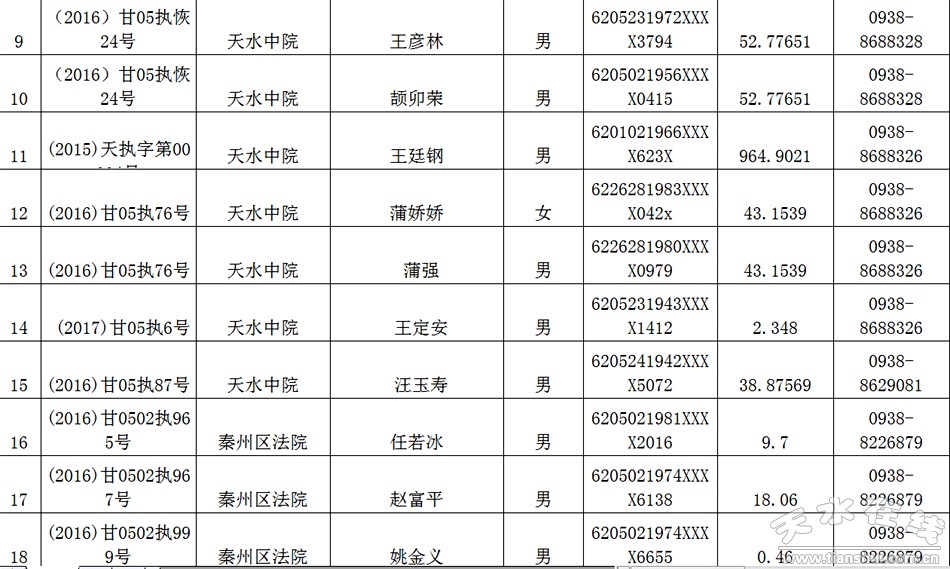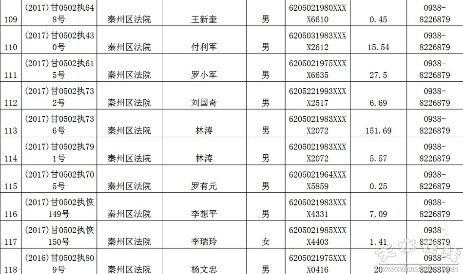 天水市中级人民法院关于公布失信被执行人名单的公告