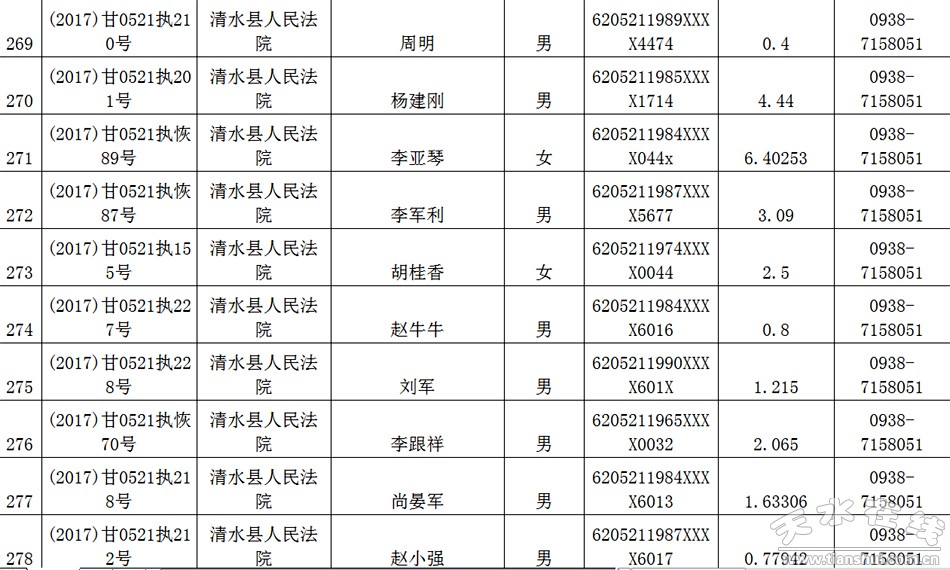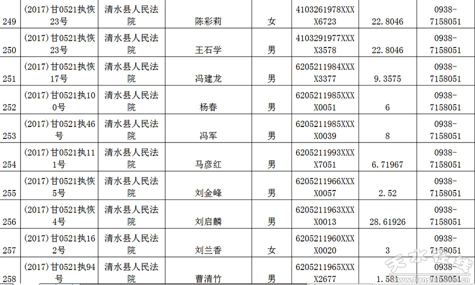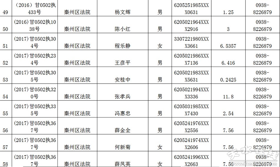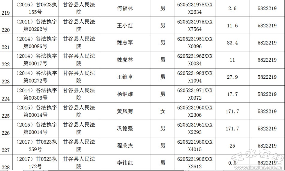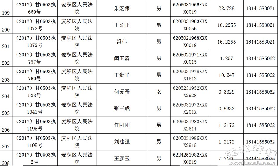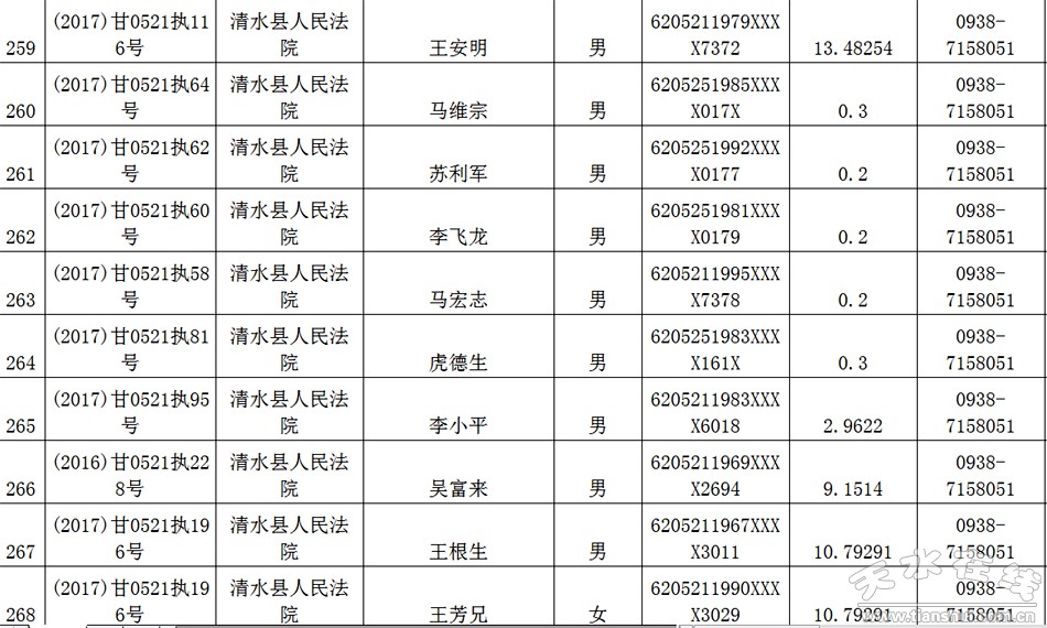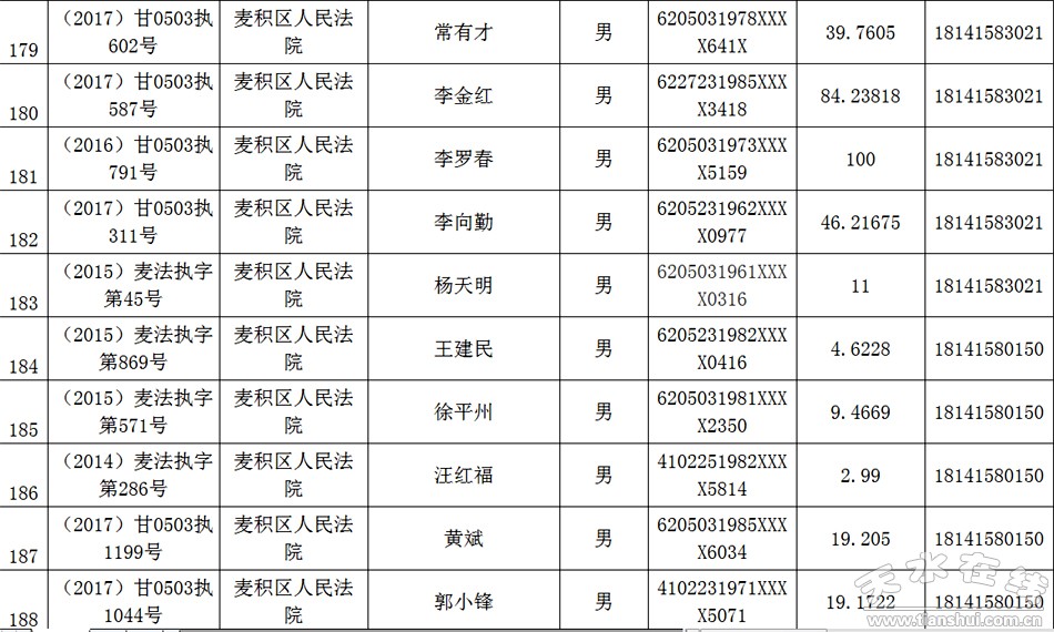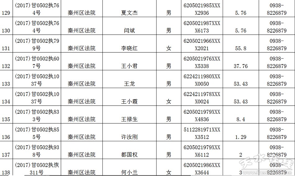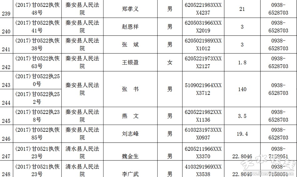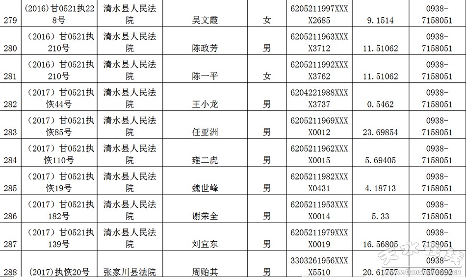 天水市中级人民法院关于公布失信被执行人名单的公告