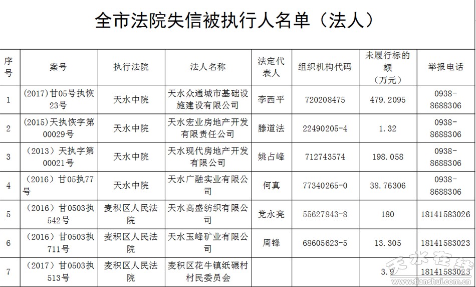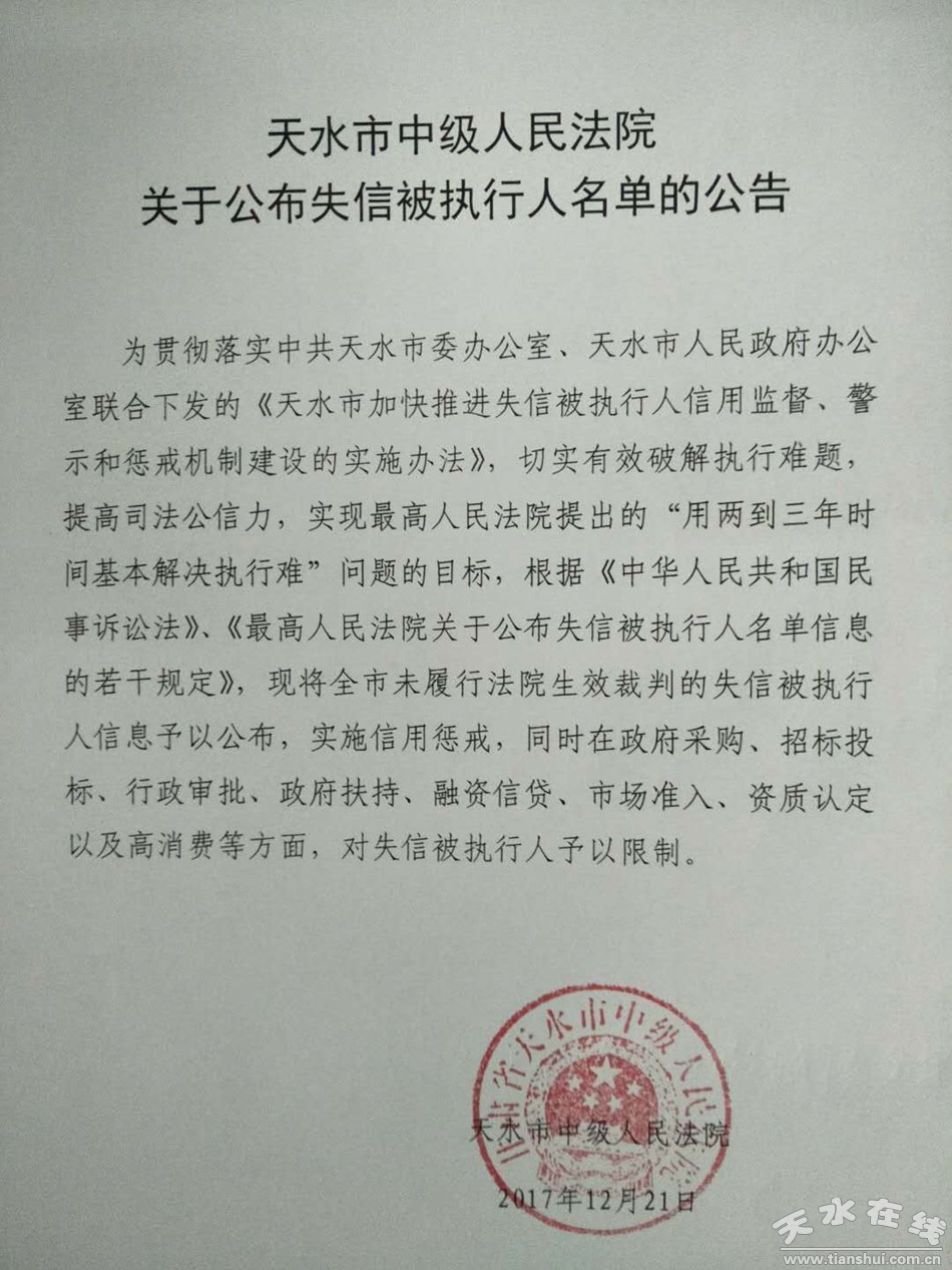 为贯彻落实中共天水市委办公室、天水市人民政府办公室联合下发的《天水市加快推进失信被执行人信用监督、警示和惩戒机制建设的实施办法》,切实有效破解执行难题,提高司法公信力,实现最高人民法院提出的“用两到三年时间基本解决执行难”问题的目标,根据《中华人民共和国民事诉讼法》、《最高人民法院关于公布失信被执行人名单信息的若干规定》,现将全市未履行法院生效裁判的失信被执行人信息予以公布,实施信用惩戒,同时在政府采购、招标投标、行政审批、政府扶持、融资信贷、市场准入、资质认定以及高消费等方面,对失信被执行人予以限制。