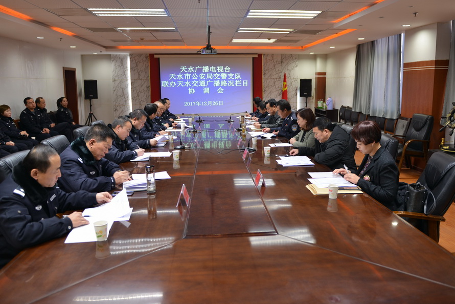 12月26日上午,天水广播电视台“交通广播”(调频FM91.9)路况栏目联办协调会在市公安局交警支队召开。市公安局党委委员、交警支队支队长柳润泰,天水广播电视台台长杨清明出席会议并就办好天水交通广播交换了意见,并提出了要求;天水广播电视台副总编辑刘晋介绍了天水交通广播的基本情况以及同公安交警部门的合作事项;天水交通广播总监雷洁组织讨论了路况报送规范;会议由交警支队副支队长何永东主持。秦州、麦积两区公安分局交警大队以及支队直属机动大队宣教工作分管领导、宣传中队长、指挥中心主任、各路面执勤中队长及支队宣传科全体人员参加会议。