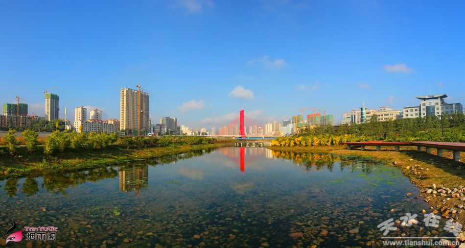 八月的天水,暑气正自消退,藉河碧波荡漾,蓝天白云之倒影徘徊在如鉴的波上,成群的鱼儿在悠闲自在的觅食嬉戏,任凭河岸游人如织,它们兀自怡然遨游着,如若泛舟河上,展望藉河两岸,车水马龙,葱茏的草木掩映着林立的高楼,给人一派繁荣兴盛的气象。