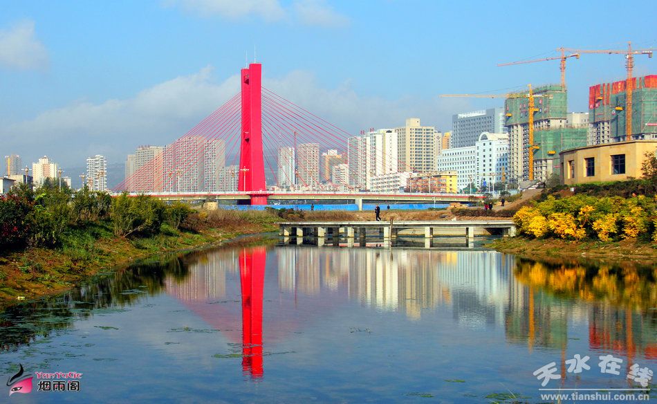 天水是先有了藉河,还是先有了华夏民族的人文始祖伏羲?这谁也说不清楚,八千年的历史,太悠久,也太漫长了,只有一则“天河注水”的美丽神话,流传着“天水”这个美丽名字的来历——是三千多年前由天上的河水倾泻而下所得。想必天河所注之水,就是美丽清澈的藉河吧,但可以肯定的是,天水这块陇上宝地的富庶丰饶,必然离不开历史上藉河河身移徙无定的冲击滩淤。如此,人类的始祖伏羲在这里创画的八卦,制定的娶嫁……等人类文明,才得以繁衍传承,就像藉河汤汤的流水一样,生生不息。