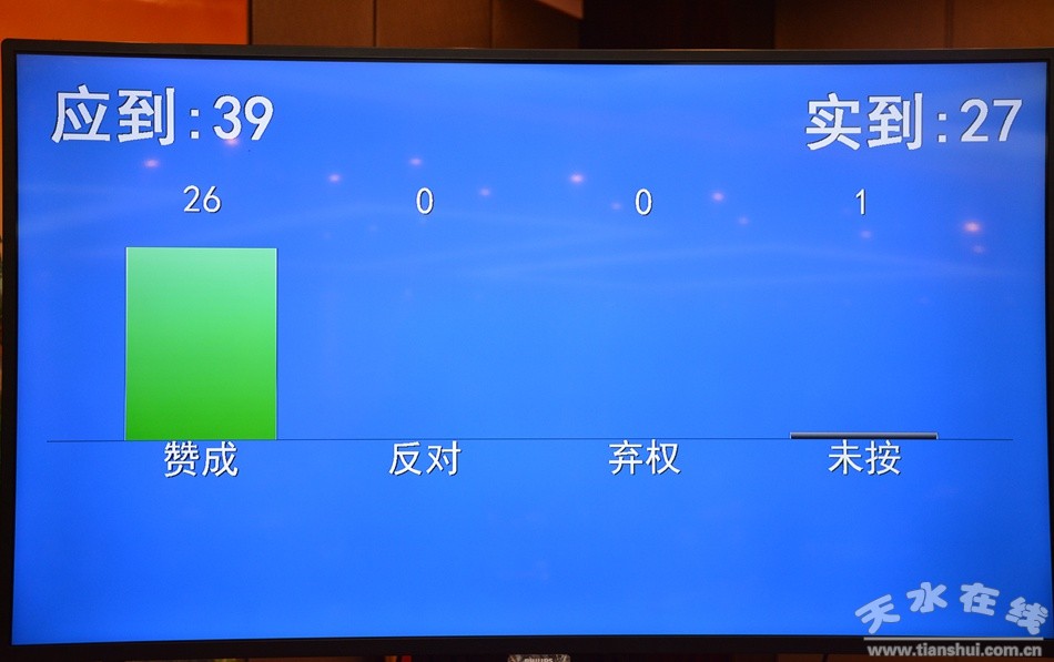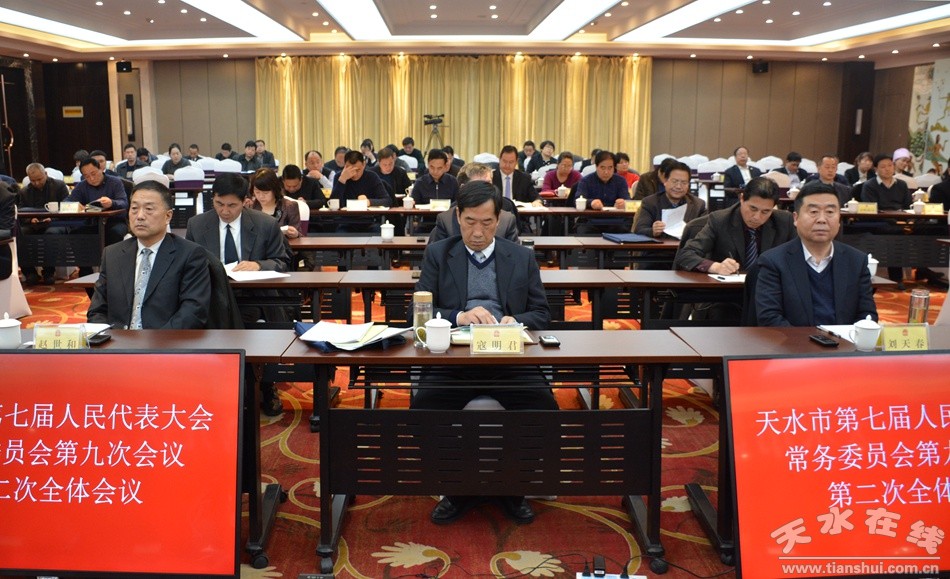 12月27日,天水市七届人大常委会第九次会议举行第二次全体会议。市人大常委会副主任张克强、蒲朝晖、宋建平、王晓琴,市人大常委会秘书长杨坤等常委会组成人员出席会议。会议由市人大常委会副主任安志宏主持。