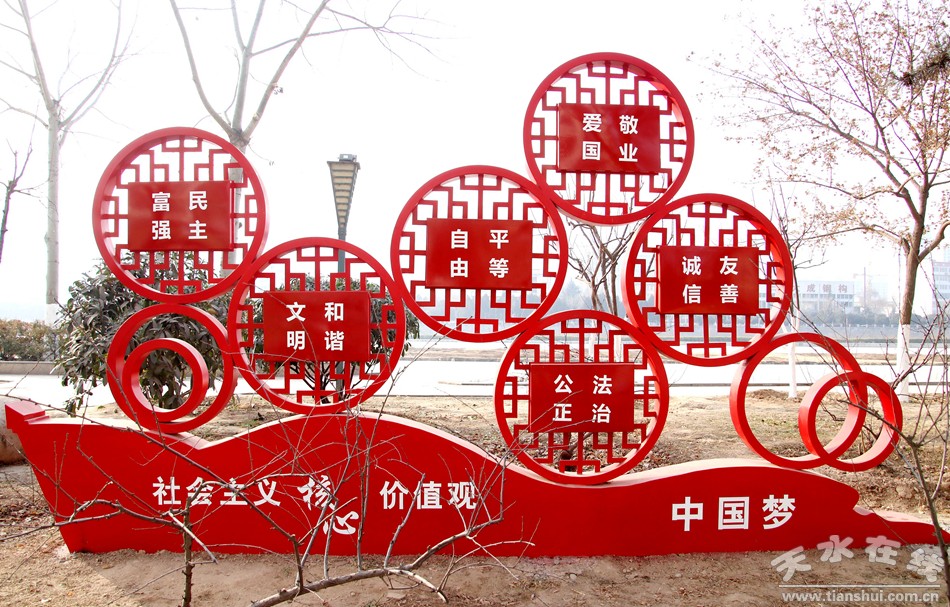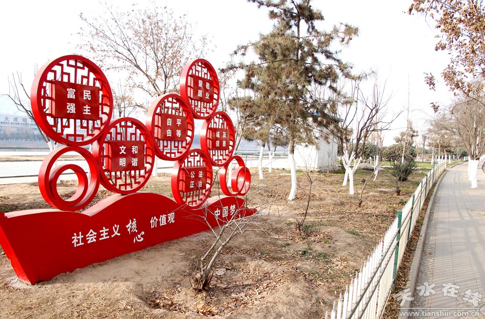 12月6日,市民常先生和往常一样在藉河风情线徒步晨练,与平日里不同是,沿途新增的以“中国红”为主调的社会主义核心价值观宣传牌让他眼前一靓,这些以“中国结”、“传统折扇”、“扬帆远航”等为主题的小品景观,不仅装点了藉河风情线,也让市民感受了社会主义核心价值观深入人心的温暖。