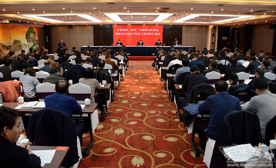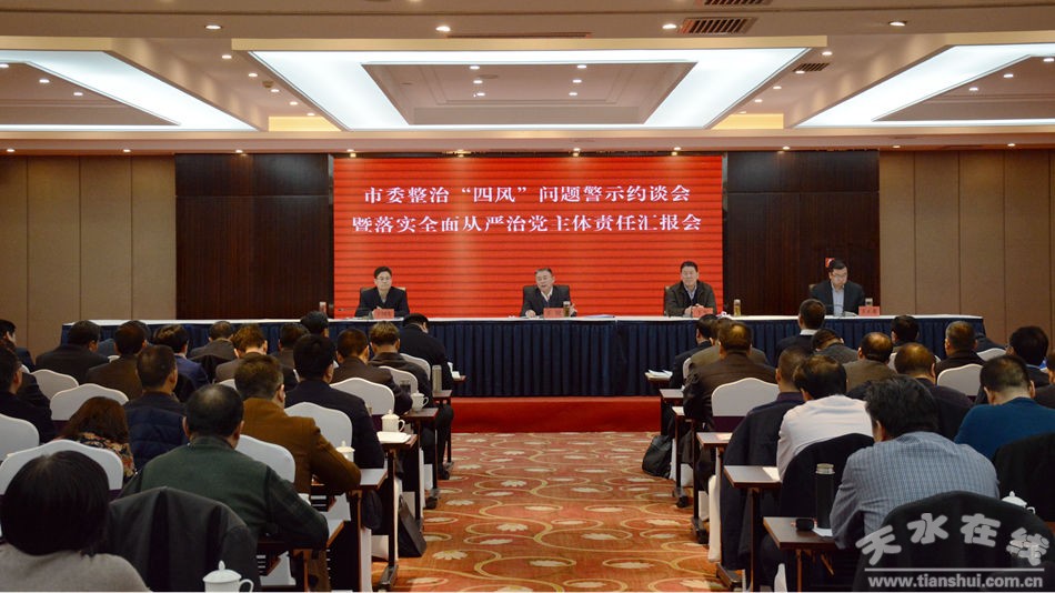 12月29日,天水市委召开整治“四风”问题警示约谈会暨落实全面从严治党主体责任汇报会。市委书记王锐讲话,市委副书记、市长王军主持会议,市委常委、市纪委书记王国先,市委常委、组织部长王正茂出席会议。