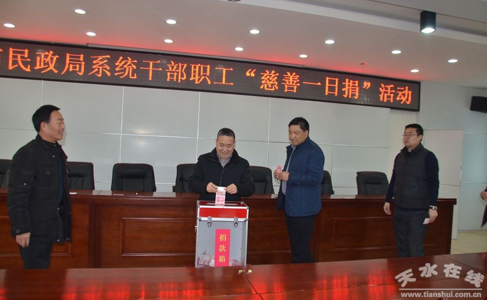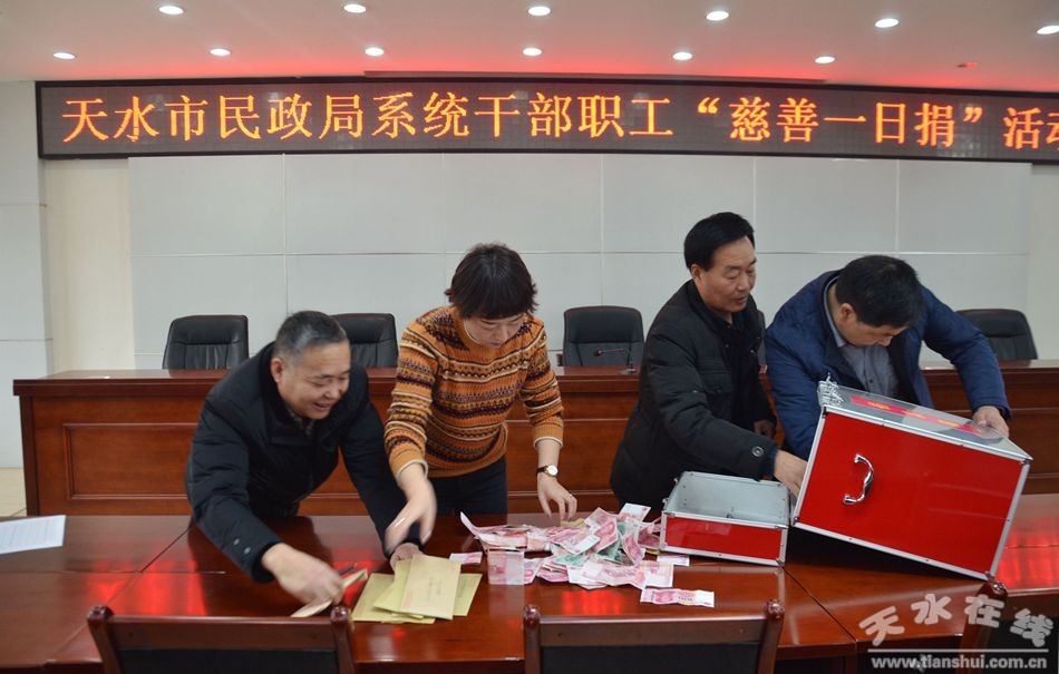 12月29日,天水市民政局开展局机关和局属单位干部职工“慈善一日捐”活动,当天共捐善款28299元,捐款将主要用于安老、扶孤、助学、助医、济困等方面。