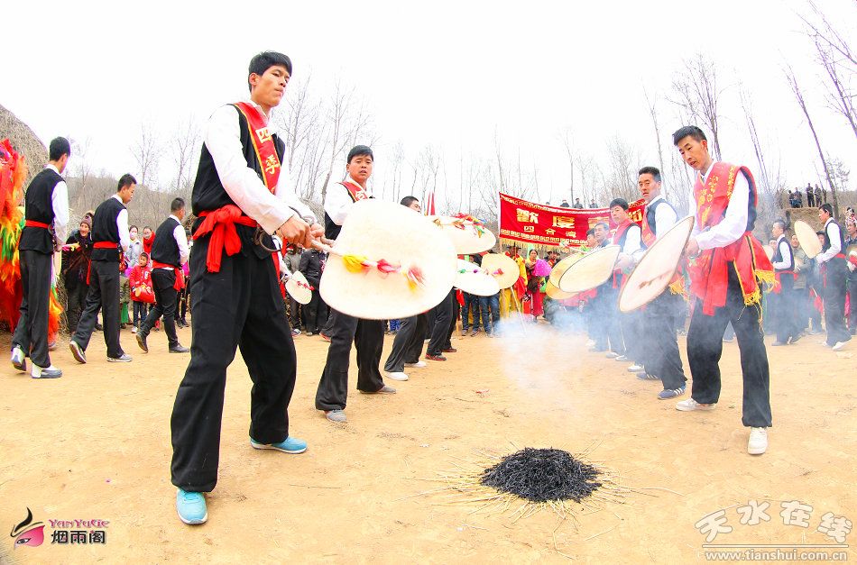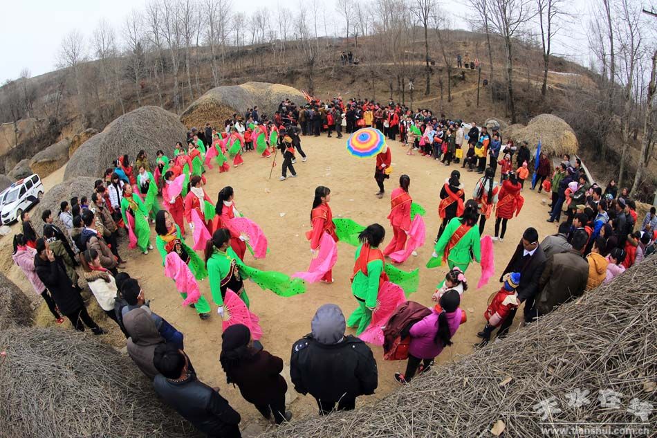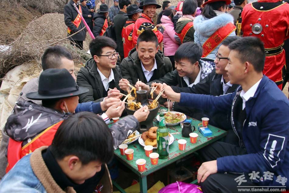 社火表演期间,村里的巧妇都拿来自己做的“暖锅子”,放着丸子、肘子肉、豆腐、粉条、白菜等10多种菜肴,参加社火表演的群众一边吃着越烧越旺的暖锅子,一边唱着武山秧歌,寓意着新年的生活红红火火,越来越好。