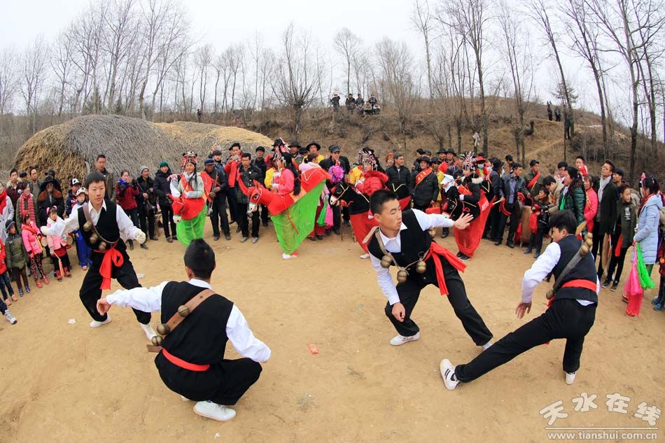 打鞭杆舞是极具地方特色的民俗文化遗产,通常为四人一组,舞者分为男女角色,男主角身背大铜铃、手持鞭杆,“船娘子”头戴冠帽、脚踏碎步,动作各异,技法多变,有“搬扎扭扣,飞刮撂挑,墩点劈挂,缠绕提扫,楂滑绞压”等三十余法,体现了武山男人的剽悍、刚烈和粗犷。