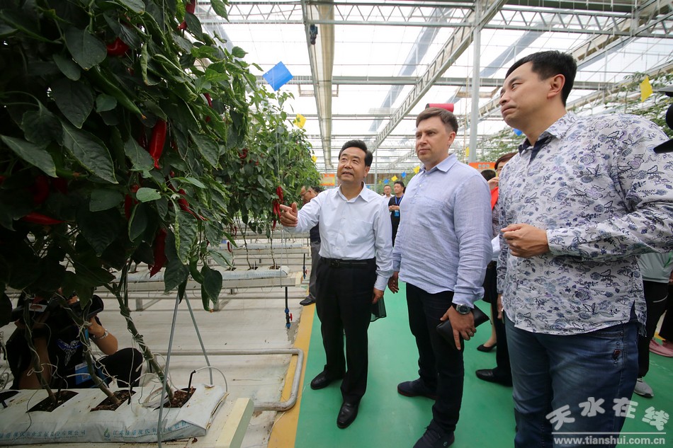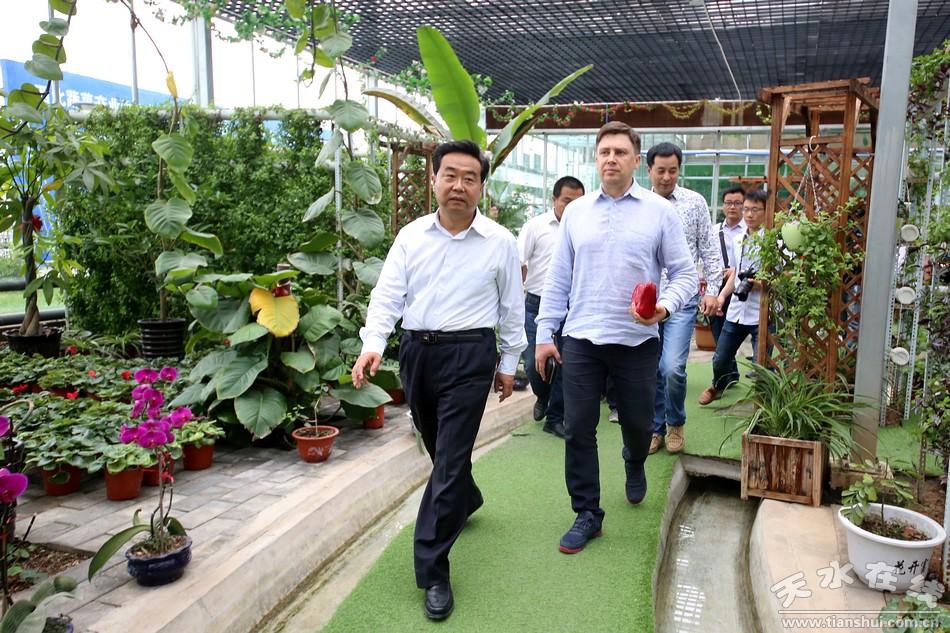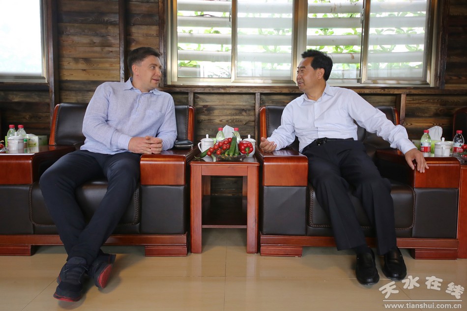 5月31日,武山县委书记索鸿宾在县蔬菜产业科技示范园区会见前来考察并出席西北蔬菜产业绿色发展武山论坛、西部特色农业发展智库对话和2017天水·武山蔬菜博览会的俄罗斯新西伯利亚州政治委员会委员、市杜马议员助理、浆果店铺食品公司创始人菲利玛宁科•依戈里先生。武山县委副书记闫斌,县委常委、宣传部长李菊霞,县委常委、统战部长唐玉芳及县委办、县招商局负责人一同会见。