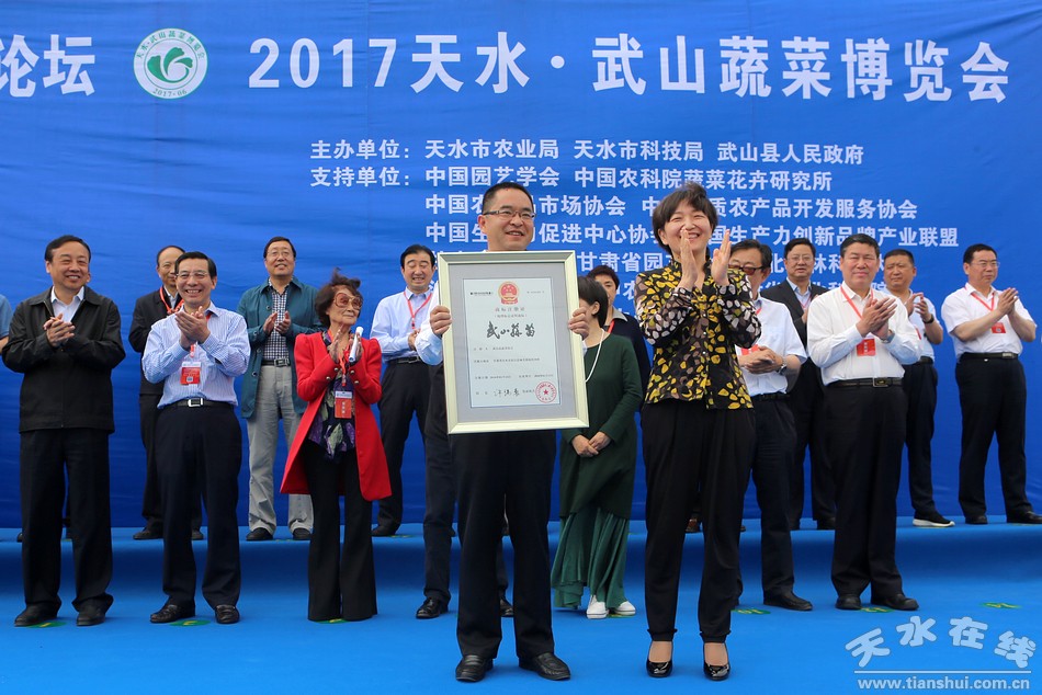 开幕式上,甘肃省工商局、省质监局还分别向武山县颁发了“武山蒜苗地理标志证明商标”证书、“省级农业标准示范区:武山北顺日光温室黄瓜标准化示范区”证书和“甘肃名牌产品:瑞德园脱水架豆王”标牌。