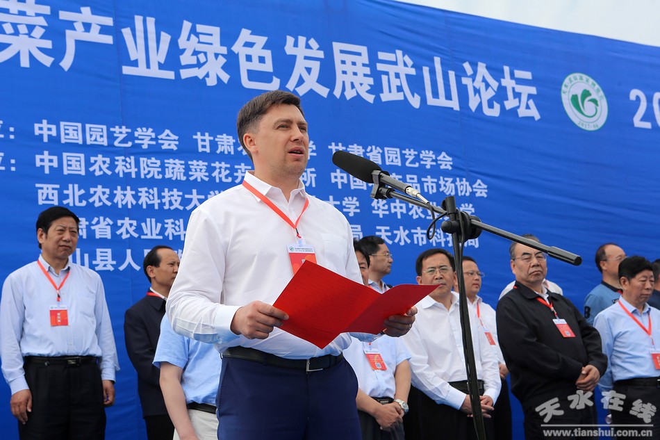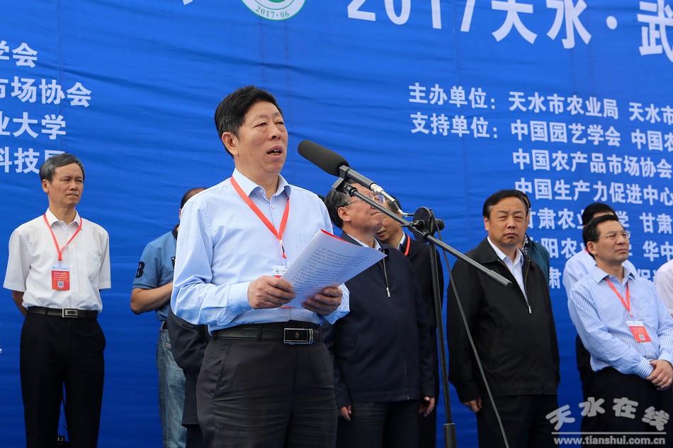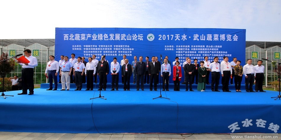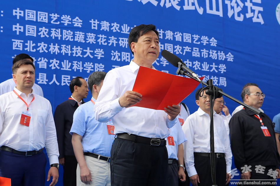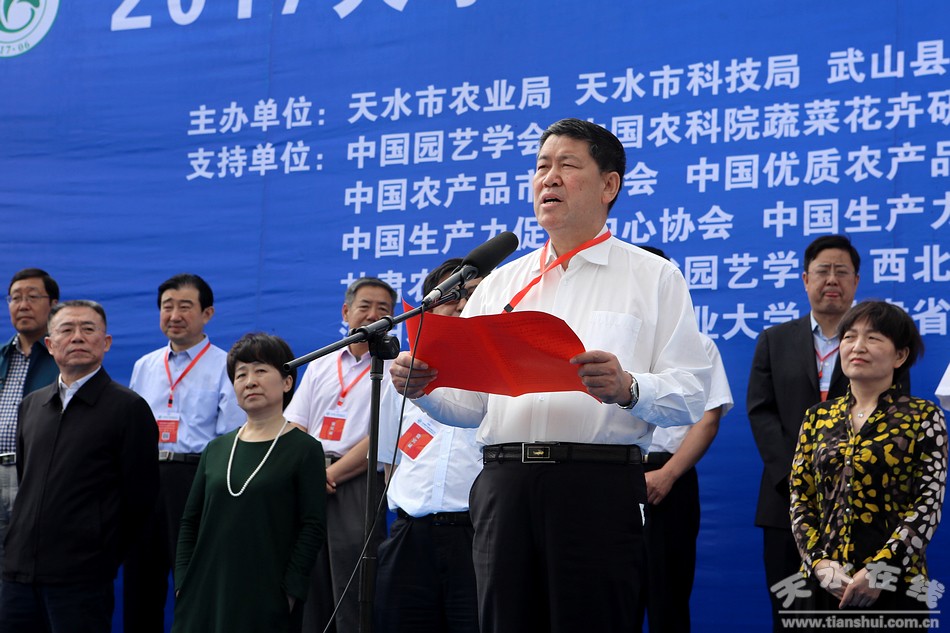 王军的开幕式上致辞,他说,举办这次西北蔬菜产业绿色发展武山论坛、西北特色农业发展智库对话和2017天水•武山蔬菜博览会,对于进一步提升武山乃至天水蔬菜产业的科技化、绿色化发展水平,打造蔬菜产业优势品牌,营造蔬菜销售氛围,扩大天水蔬菜产业影响,推动天水由蔬菜大市向蔬菜强市迈进,都将起到十分重要的作用。天水市委、市政府将继续按照“做大规模、做优品质、做亮品牌”的要求,深入实施蔬菜产业技改增效工程,在基地建设、安全生产、品牌创建、科技创新、市场营销等方面进一步加大扶持力度,努力打造全省一流的蔬菜生产基地。他同时希望与会来宾在我市蔬菜产业发展方面多把脉会诊、传经送宝、拓展销路、宣传造势,帮助和指导天水把工作进一步做好,让蔬菜产业在脱贫攻坚和全面小康建设中发挥更大作用。