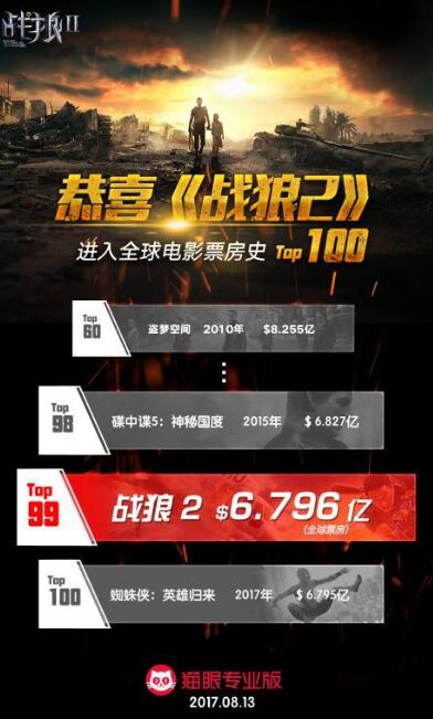 根据猫眼专业版票房数据显示,《战狼2》在8月13日下午全球累计票房6.796亿美元,其中海外票房100多万美元。根据BoxOfficeMojo票房数据显示,全球票房排第99名的影片为《蜘蛛侠:英雄归来》,全球票房为6.795亿美元。目前,《战狼2》全球票房已超过《蜘蛛侠:英雄归来》全球票房成功跻身全球TOP100票房影片榜,这是亚洲电影首次入榜,打破了好莱坞电影对该榜的垄断。