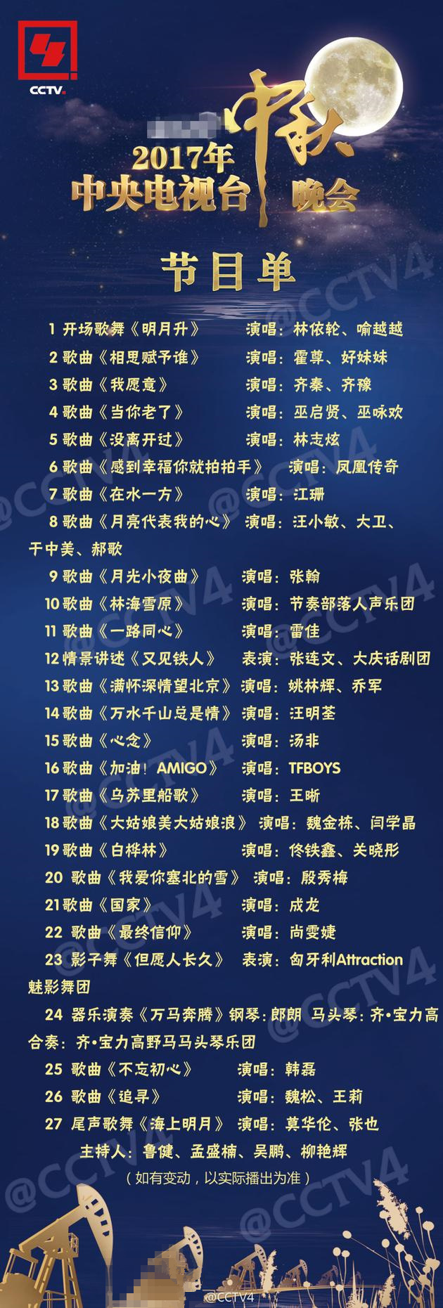 9月24日晚,CCTV-4中文国际频道通过微博曝光2017年中央电视台中秋晚会节目单,从节目单中看出,今天的明星阵容非常的强大,林依轮第一个为开场做表演,关晓彤将搭档佟铁鑫献唱,郎朗、齐秦、韩磊、张翰、齐秦齐豫姐弟等都会有精彩的演出,另外TFboys、成龙也会加盟,不仅汇聚了大陆及港、台华语乐坛众多一线实力唱将,还有蜚声国际的著名钢琴演奏家郎朗和马头琴演奏家齐·宝力高一起来“众星捧月”。