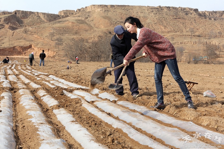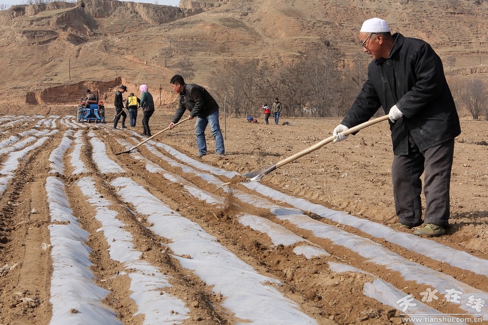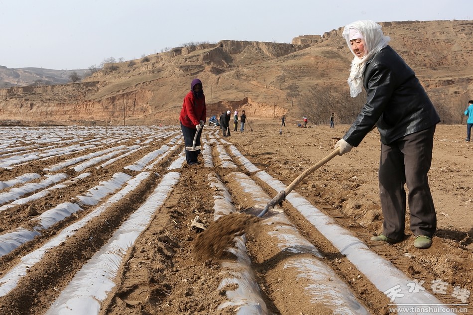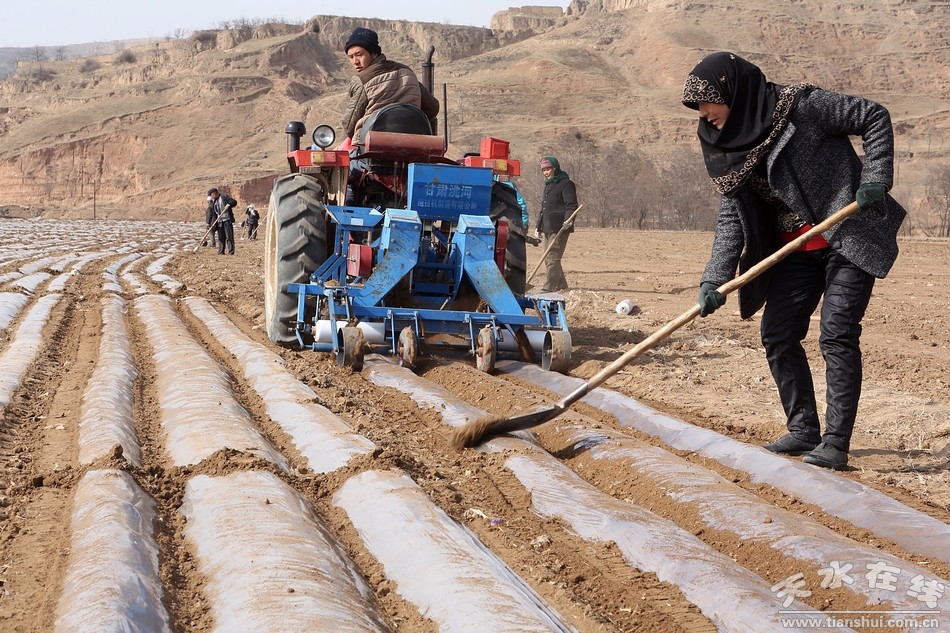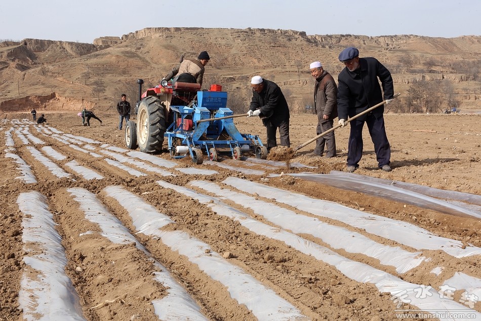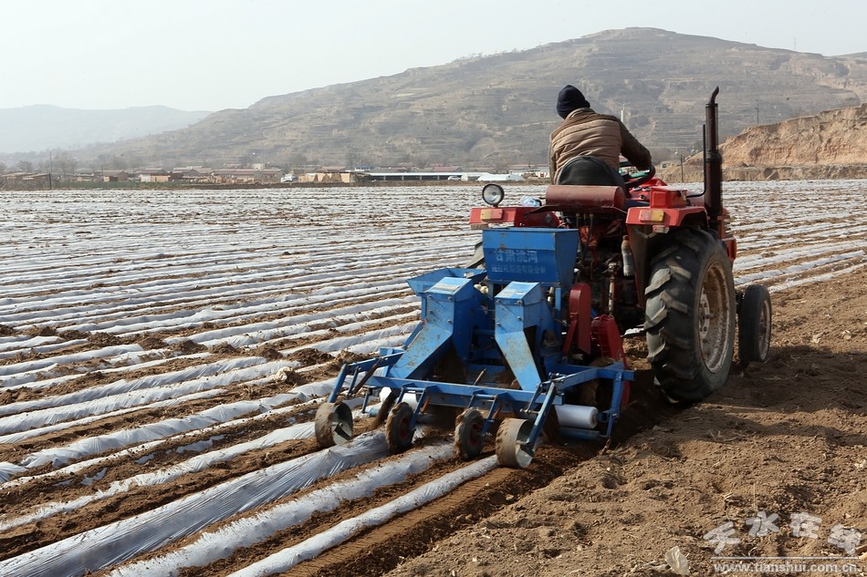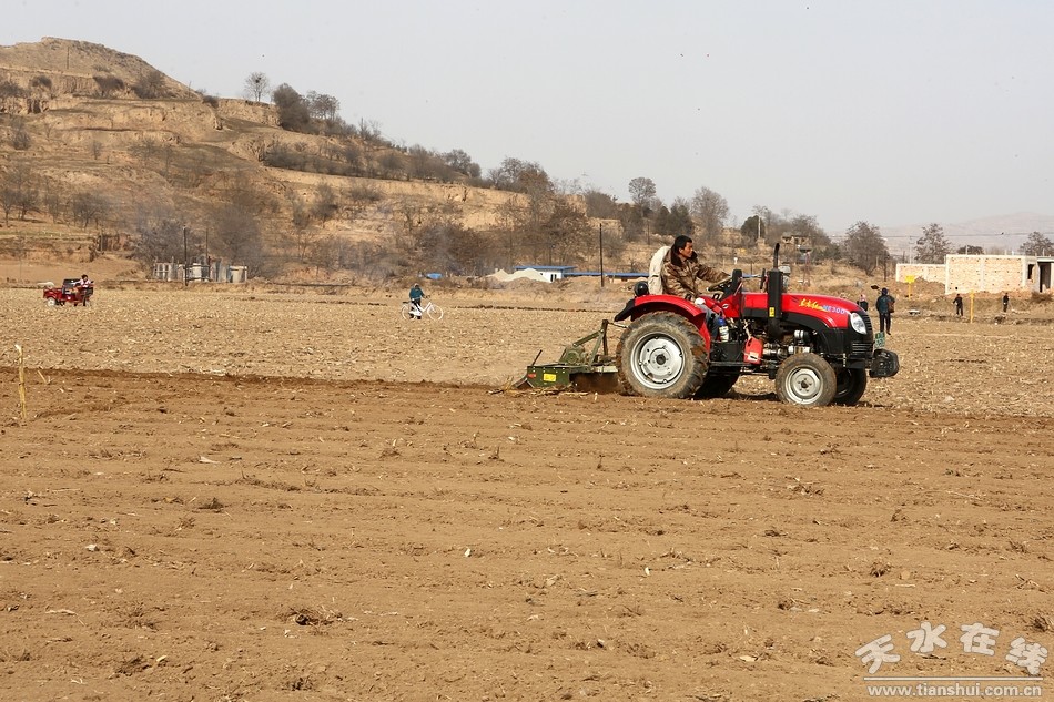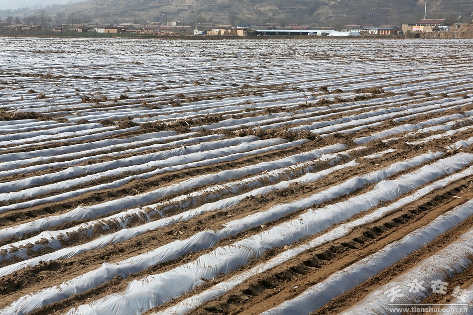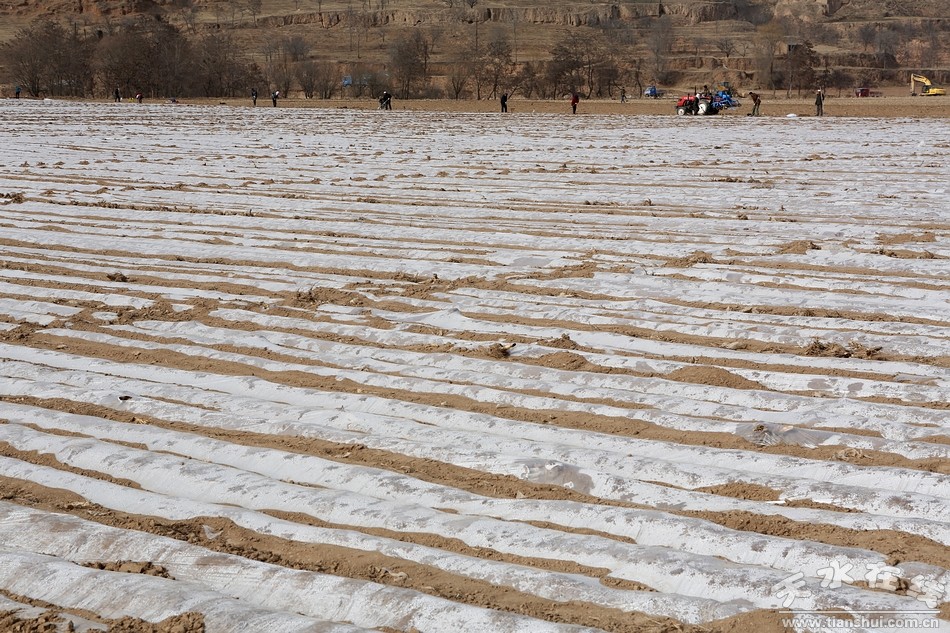 (张家川县龙山镇疙瘩川全膜双垄沟播玉米县级示范点春耕现场)