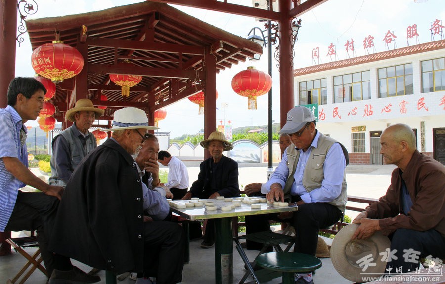 (张家川县大阳镇闫庄村群众在新修建的文化广场上下棋)