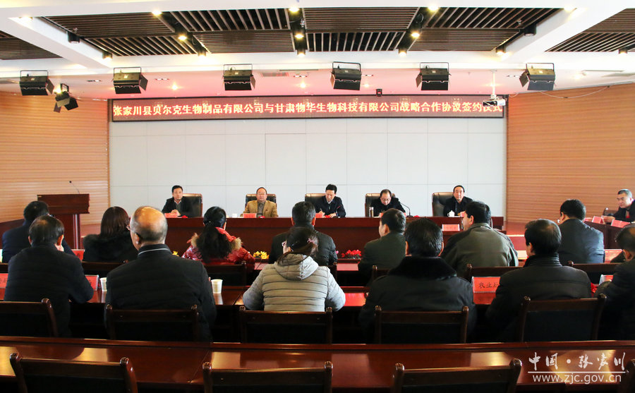 12月27日上午,张家川县贝尔克生物制品有限公司与甘肃物华生物科技有限公司签订战略合作协议。天水市中小企业局局长杨志刚,县委常委、统战部长李国恩,县政府副县长马庭坚出席签约仪式。