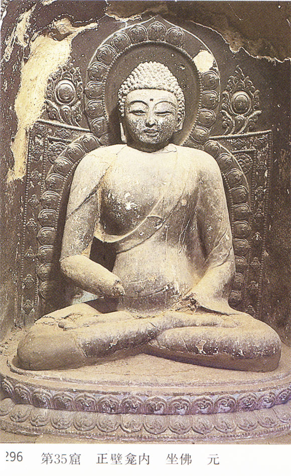 此窟较小,位于东崖第336窟左侧,亦为方形四角攒尖顶窟,原系北周开窟,现存正壁龛内坐佛,面形圆而短,头顶作螺纹肉髻,坐下莲台及莲花定珠背靠装饰,种种皆属密宗造像风格。麦积山石窟经北宋修缮之后,南宋建炎、绍兴年间,秦州为金人所有,麦积山虽然地处宋军所辖地界,但经常疲于战祸,加之山寺田产多受占夺,寺僧大部逃散外方,几再次濒于荒芜,直到明代,修茸之一举方又兴起。现存数处后修造像,颇似元代风格,或可说明在麦积山石窟,元代近百年中亦并非毫无建树。此窟内已全部熏黑,壁画无存,造像仅此一身。