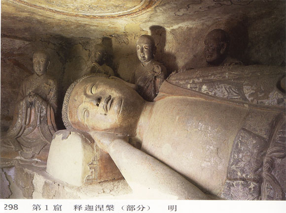 此窟位于东崖最东端,为三间四柱崖阁,早期建于元魏。窟内横长方形,平顶,正壁起通壁宽佛坛,坛上塑卧佛一身,长6.30米,右胁而卧,为释迦牟尼人般涅槃的形象,身后塑十大弟子举哀。造像经历代重修,已非原貌;卧佛似仍为原胎,现状略显唐风,众弟子则皆为明塑形象。足端坐一供养人,身着明代官服,是明代妆修施主的供养像。十大弟子,表情各异,显示出不同的个性和修养,尽管塑造上不免俗恶之处,仍有数身感人之作。