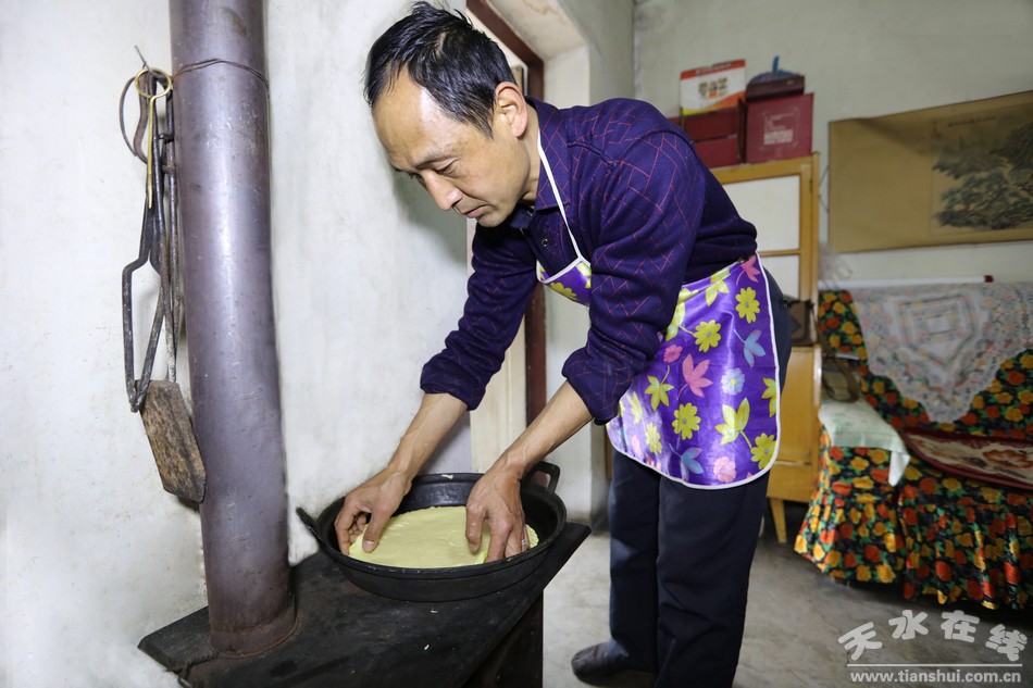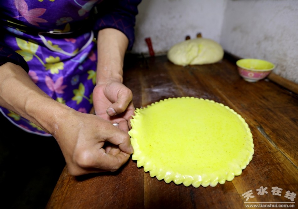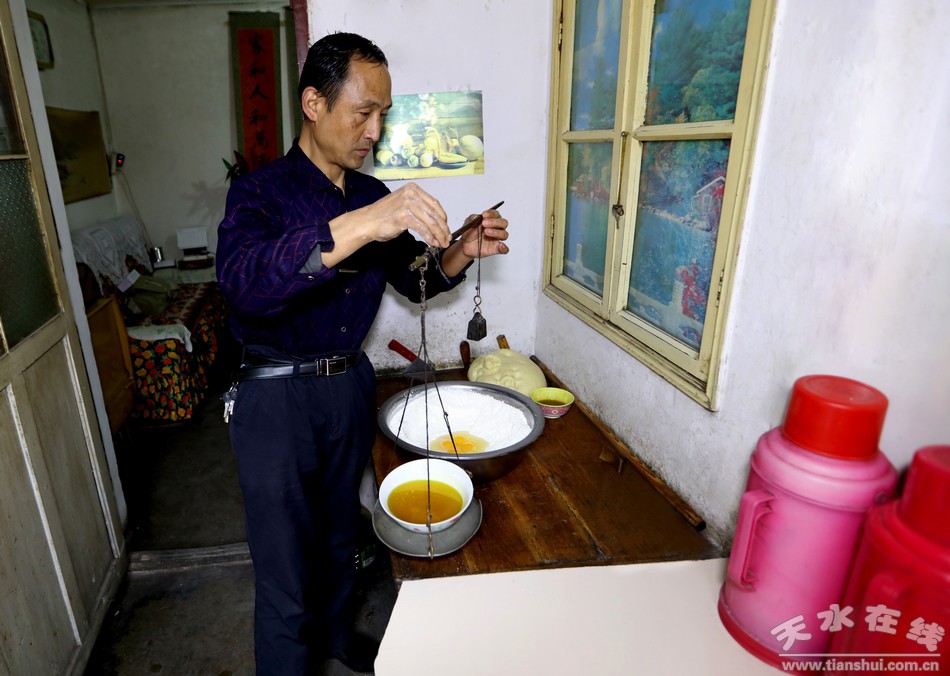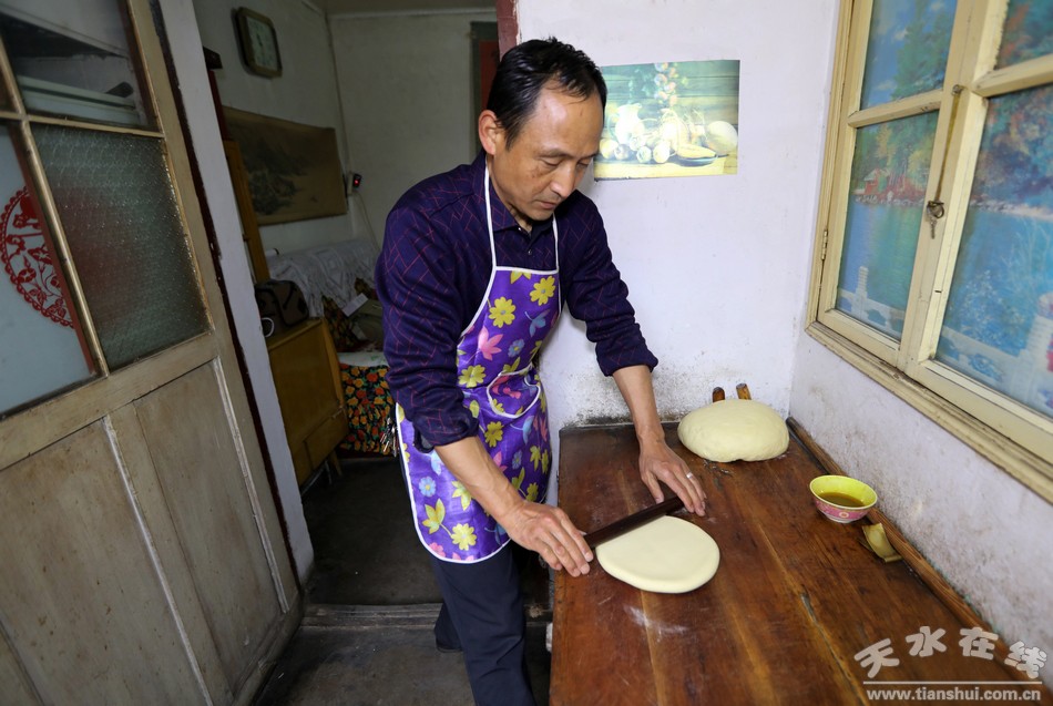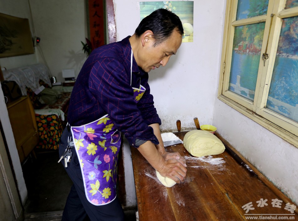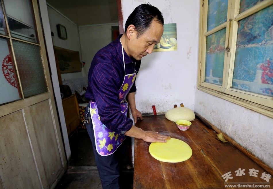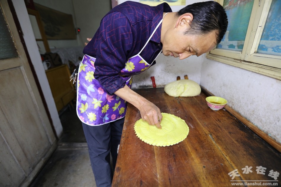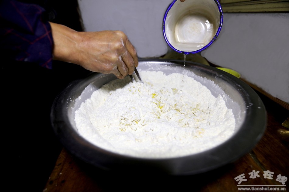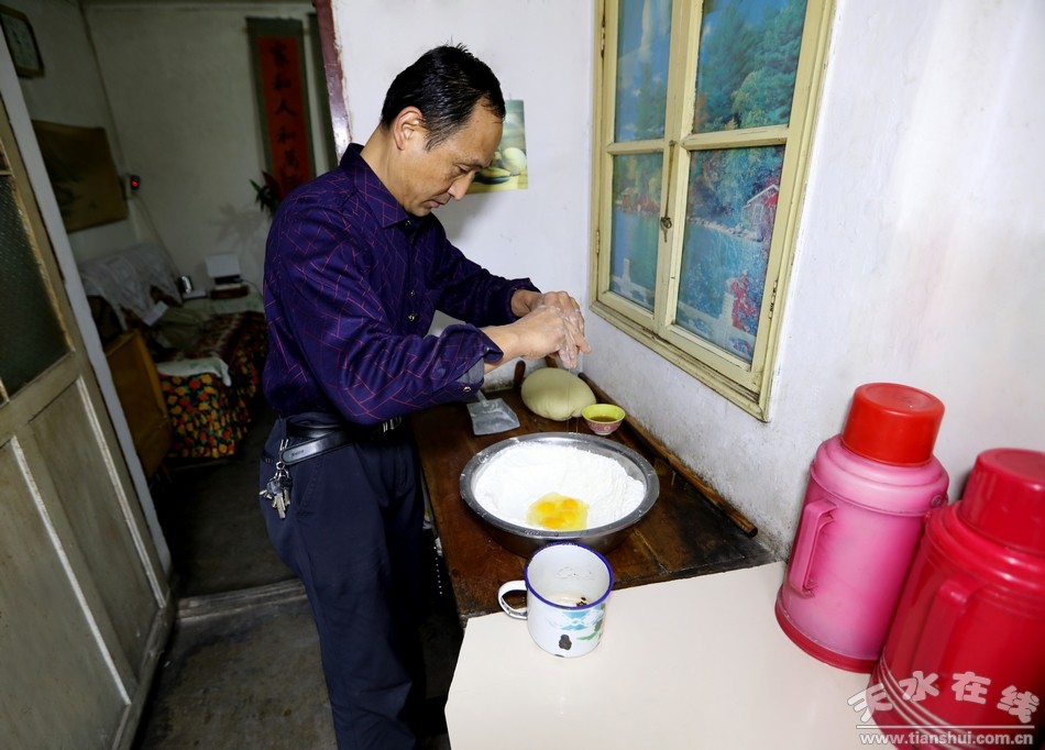 穿过古老的天水小巷道,走进陈旧的小院里,几间高矮错落的小平房和一面大红铁门便是这个小院的全部景色。厨房紧挨着客厅,客厅里的小套间是个小卧室,这就是袁江师傅的家。“我们家祖祖辈辈都是做花馍馍的,从我太爷那辈人开始传到我这辈已经相传四代了,现在我也不年轻了,比不了前些年从早到晚不停地做馍馍,平时有人来家里定做花馍我就在家做几个,只希望这份祖传手艺不要失传就好啊。”说着,袁师傅拿出一个大盆,挖出几瓢白面粉倒进盆里,便熟练的开始了花馍的“制作”。