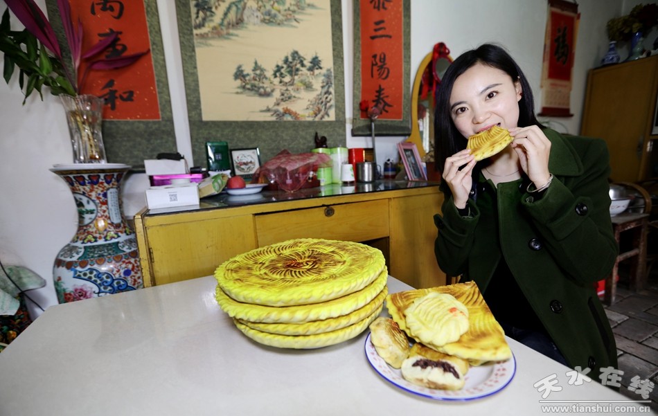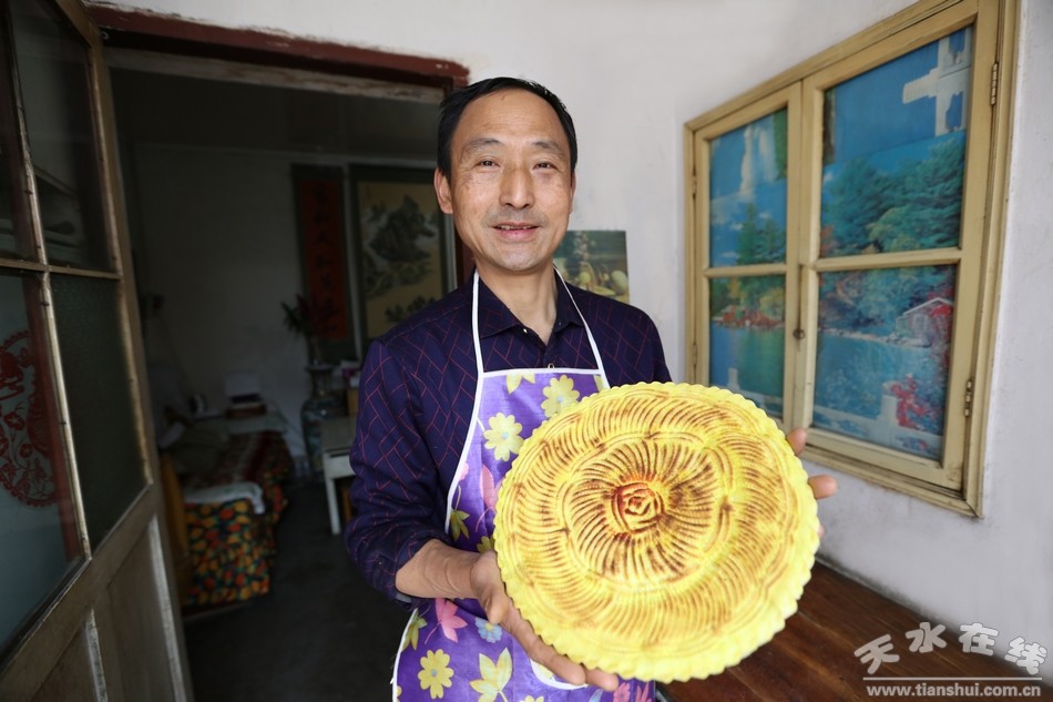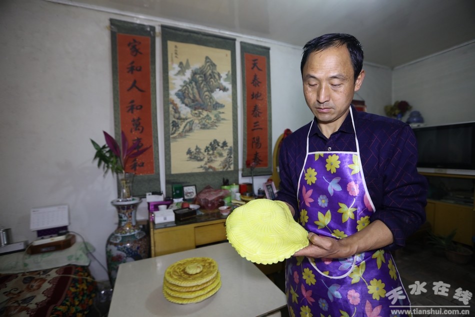 在今年天水伏羲庙春祭伏羲典礼上,袁师傅制作了四斤面、直径两尺多的大花馍,花馍正面底纹为3圈麦穗纹围绕的花朵,上面有立体的阴阳面花,代表稳定和力量的等柱石,当作祭祀贡品专门献给伏羲爷,以表敬祖之情。可见袁记花馍在天水的影响力之大。