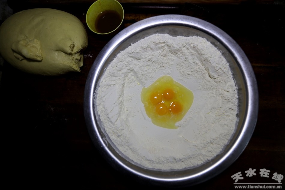 袁师傅倒进盆里的面粉大概有四斤左右,他先是往盆里打了四颗鸡蛋,随后再倒入四两清油,“这面粉和鸡蛋、清油的比例必需分别都是1比1才可以,放多了吃起来太软,放少了又太硬,非常影响花馍的口感。”说完他用手又抓了少量的盐和香豆粉洒在面粉里,接着滴了几滴白酒,最后揪了一小坨提前准备好的酵子面团仍进了盆里。“酵子是发面最好的东西,虽比不上现在人们常用的发面粉方便,可酵子做的馍馍口感永远是最好的。还有这盐和香豆粉都提味用的,滴些白酒是为了让花馍味道更醇香,而且还能起到长久存放不变质的作用,这可都是祖传秘方啊。”袁师傅一边笑着,一边开始和面。