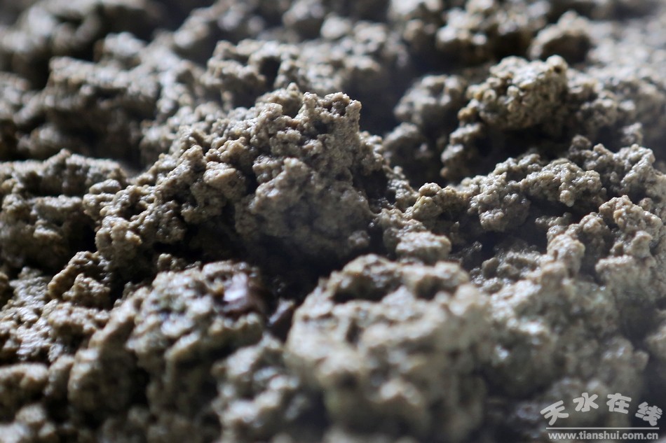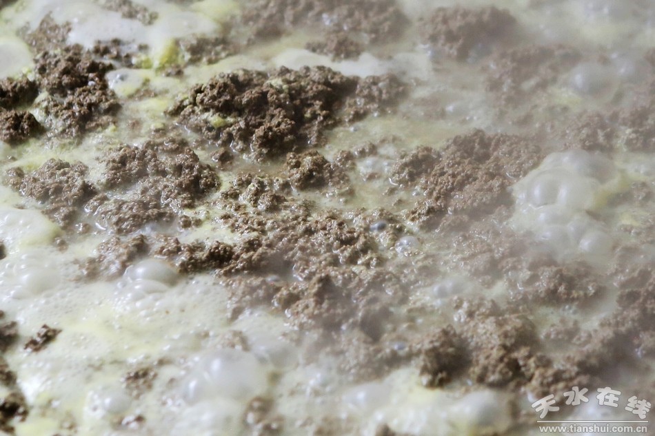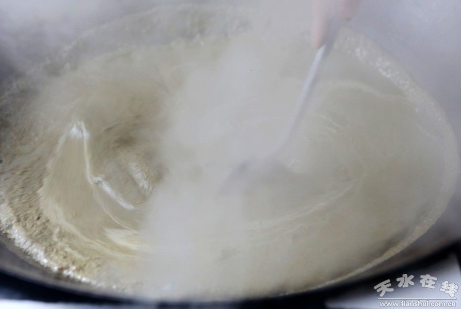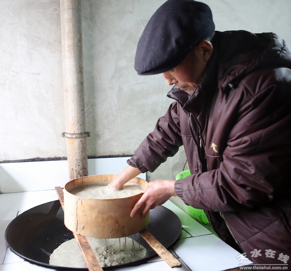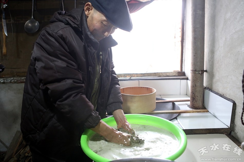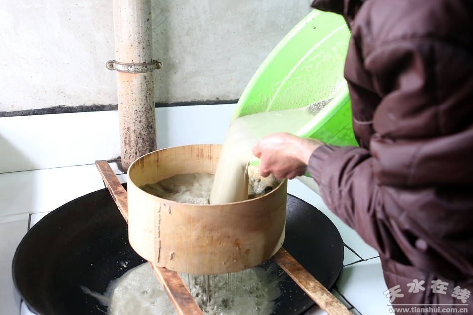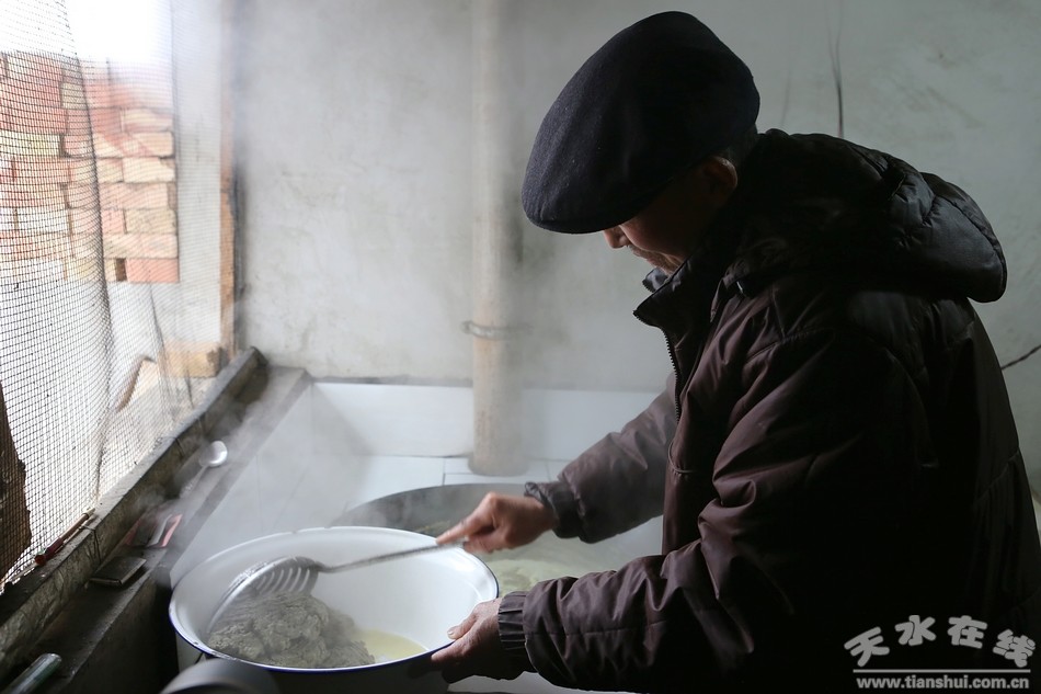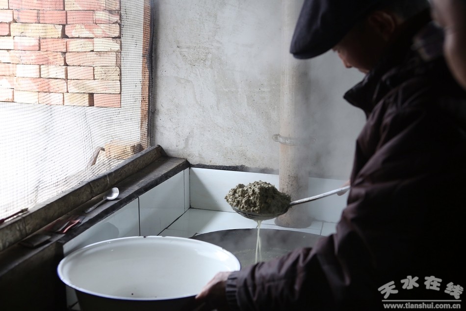 麻仁淘好后,就该煮麻腐了。高旺生在锅上支起一个木架,将淘洗出来的一盆麻仁水倒入滤网进行二次过滤。“咱秦安人做东西,就讲究个精细,做麻腐一定要把麻子皮清洗干净了,不然做出来的食物吃到嘴里扎舌头,口感不细腻。”高旺生小心翼翼的往滤网里面倒水,灰绿色的汁水通过滤网,过滤至灶台上的大锅内。滤网内剩下的残留物,是细小的麻子皮,过滤后的麻仁水,就可以烧锅了。给灶里添上火,等到锅里的汤汁慢慢沸腾,高旺生拿起勺子开始缓缓的在缸里翻搅,几圈下来,汤汁里面的麻腐慢慢凝结在一起,满屋都是一股麻子特有的醇香。“煮麻仁的制作工艺与点豆腐有些相像,成品又和豆腐质地相似,所以我们就管这东西叫麻腐。”大概十五分钟后,高旺生将麻腐捞出,过滤出残留的汁水,这麻腐就算是做好了。