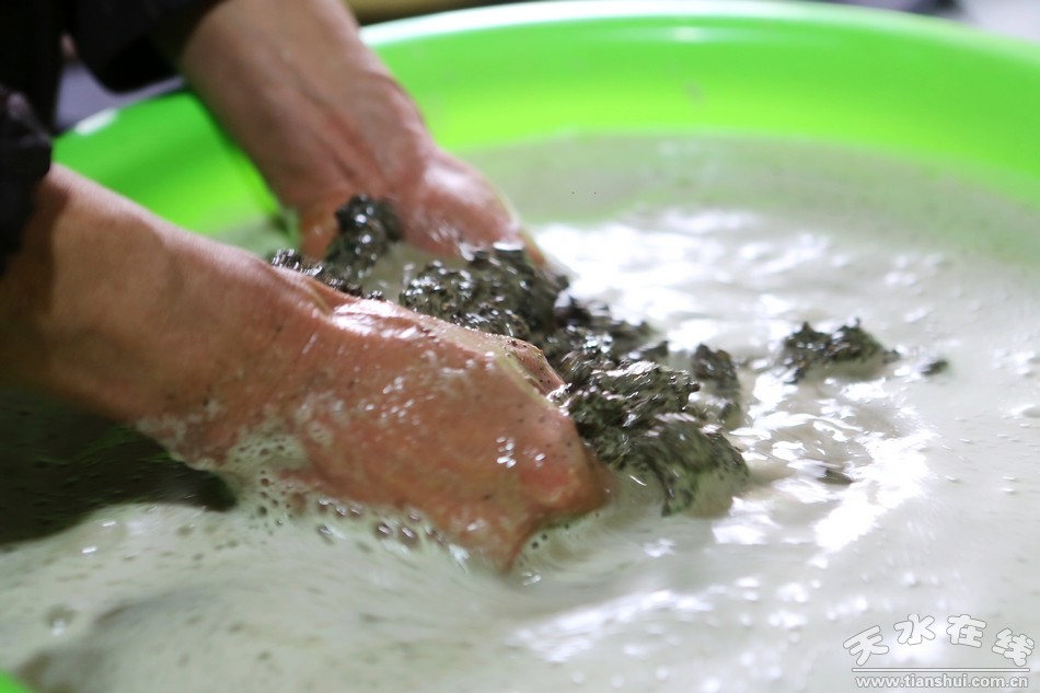 麻子磨碎后,高旺生热情地吆喝我们跟他去房顶上煮麻腐。他边上楼边告诉小编,他们家磨的大多都是内蒙古的麻子,颗粒饱满,个大瓤鲜,做出来的麻腐吃起来更有滋味。“麻子不像小麦可以在剥皮机里去皮,它只能先在石磨上连皮带仁的碾碎,再到水里手工挑拣麻子皮,每天光分筛杂质就要花一两个小时。”高旺生在作坊的桌台上支起三个大盆子,里面盛满热水,倒入碾好的麻子开始一遍一遍地淘仁。他的手慢慢的在盆子里搅动,一边搓洗麻仁,一边将漂浮在水面上的麻子皮挑拣出来,反复三四次,终于将麻仁淘洗干净。