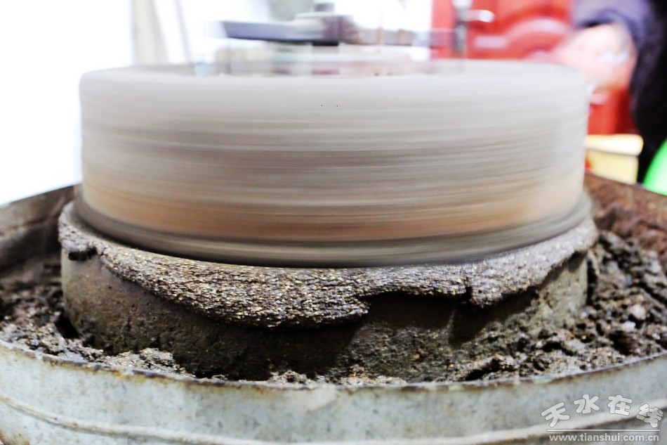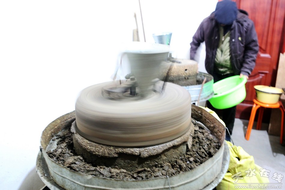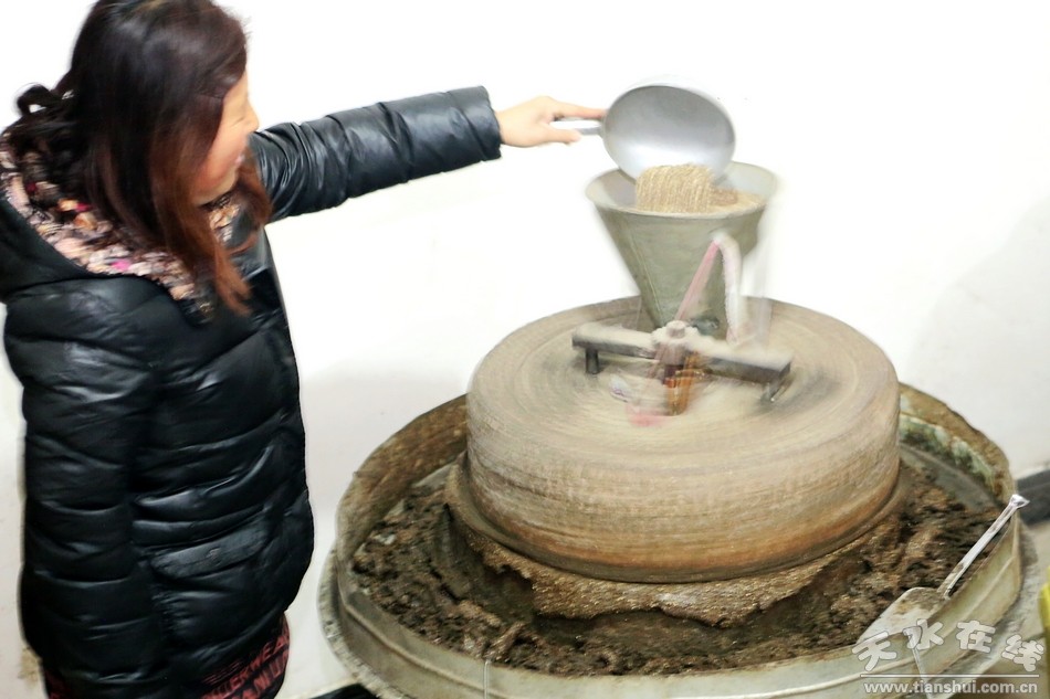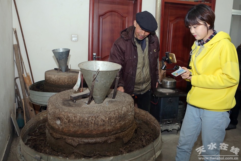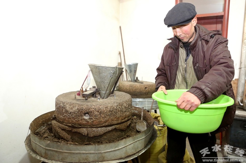 一走进高旺生家,就看到他和妻子王慧明正在张罗着磨麻子,“来得可真巧,我们正准备给秦都明悦酒店做麻腐呢!”高旺生娴熟地舀起一勺麻子,倒入石磨上的漏斗里,“因为现在餐饮市场对麻腐的需求量增大,做麻腐的人又少,我们磨麻子都改用电石磨了,比以前的石磨能省时省力一些。”高旺生说着,给石磨通上了电,只见麻子一颗颗滚进带凹槽的石磨间,随着一阵噼里啪啦的响声,麻子粒被碾碎成了泥状,一股麻子仁的香味漾满小屋。