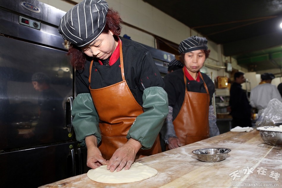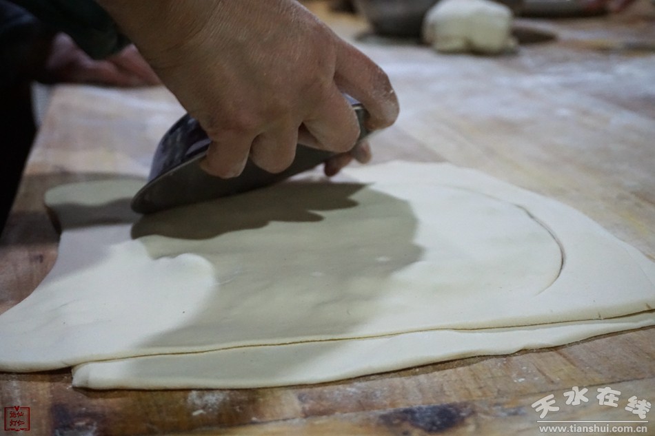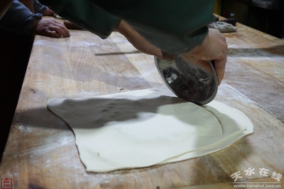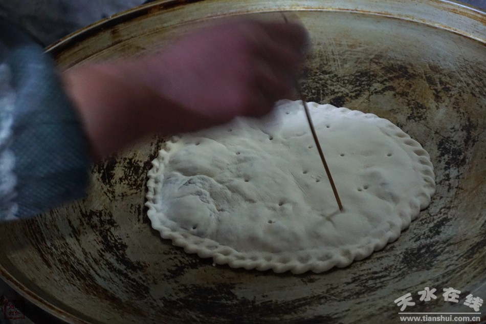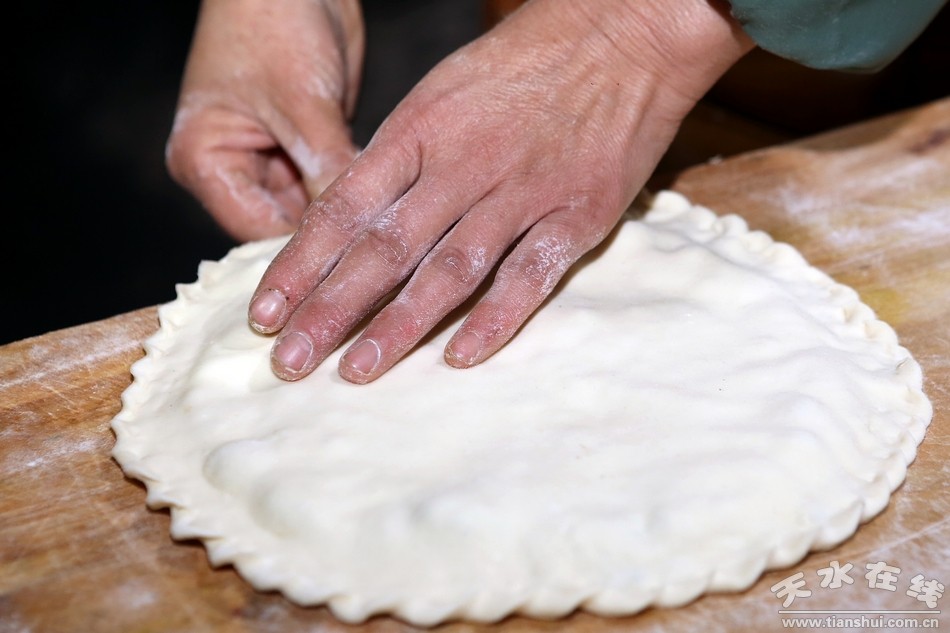 这边热气腾腾的麻腐刚出锅,那边已经和好面准备放馅料了。只见几个女厨师飞快的把面团擀成两张薄面片,一张放在案板上,将炒好的馅料呈圆形均匀地抹在上面,另一张盖在馅料上,压边捏花。紧接着就是烙饼了,将麻腐饼扎上小孔放入预热好的电饼铛里,用200度以上的火烙五分钟左右,等底面烙熟泛黄后,将其翻面,待麻腐饼两面微黄而不焦即可出锅。
