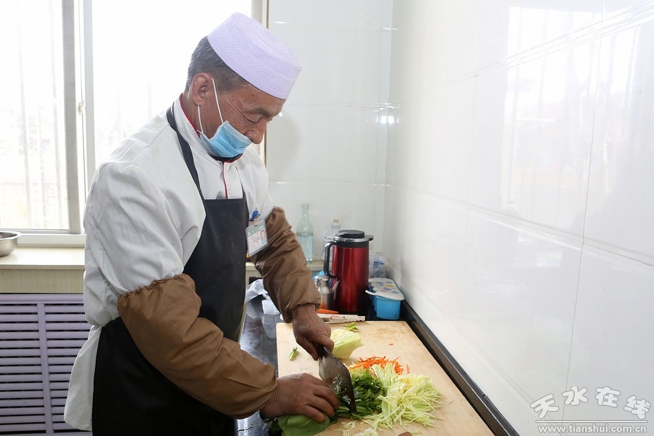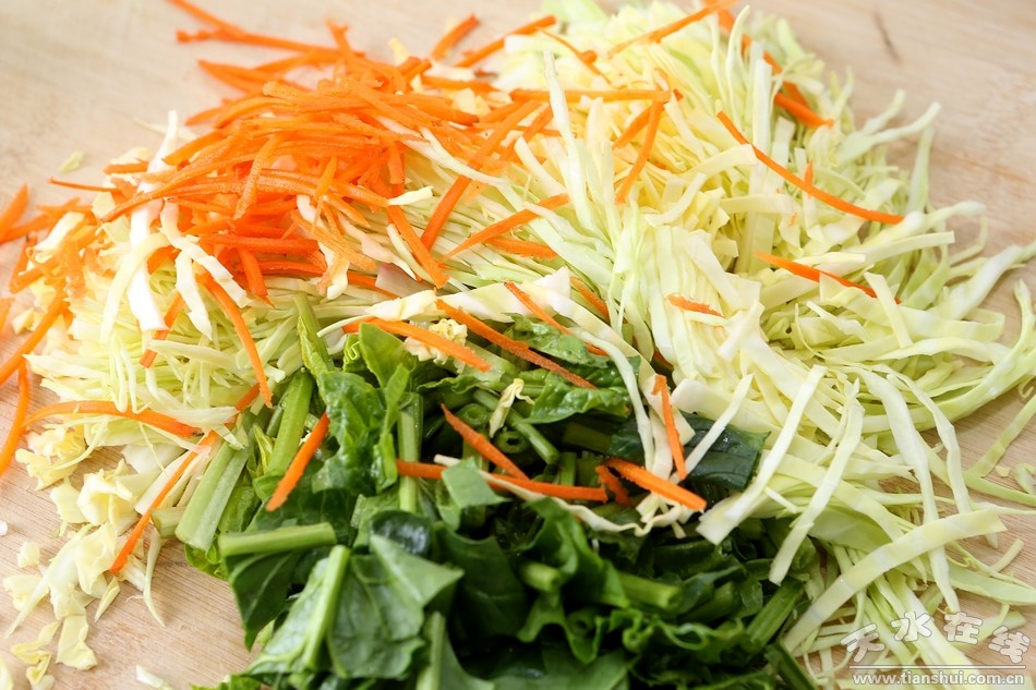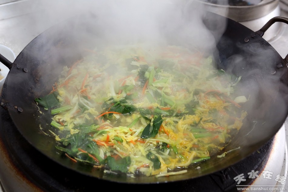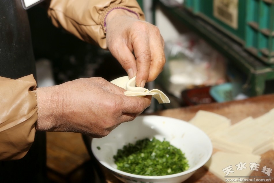 扁食的美味固然离不开精心准备的各种佐料,而其它的搭配食材也是必不可少的,作为“主厨”的马师傅刚放下锅又立即拿起菜刀开始准备其它食材,而最重要的“包扁食”反倒是交给了他的几个“助手”。只见几位大妈一手拿着切好的梯形状的面片,一手撮起适量的韭菜末放进面片里,将馅料完全包裹住,再将面片上下对折粘合在一起,最后用手将面片边缘捏紧,一颗小小的扁食就被扔进了铁盘里。大妈们的那两只手完美地配合,迅速又稳快,小编观察了一下,这手法和速度,估计一分钟至少包四五十个没问题。“我们清水的扁食与其它地方的相比,其独特之处不止在于佐料和食材,这扁食馅也是有区别的,清水扁食的馅很简单,或只是韭菜或只是葱花,而且数量也不多,吃的就是这种似有非有的感觉,不过搭配扁食的各种蔬菜和佐料可是相当重要,缺一不可。”大妈们悉心给小编解释着清水扁食的独特之处,但也丝毫不影响她们包扁食的速度,不一会,包好的扁食基本已经够给客人们享用了,另一旁的马师傅准备的食材也差不多了。才没几分钟,那一堆胡萝卜、菠菜、包菜、豆芽等各种蔬菜,在马师傅熟练快捷的刀工下已全都变成了丝状,安静地躺在菜板上,再将这些切好的菜放进锅里稍煮片刻,到八成熟便可食用。