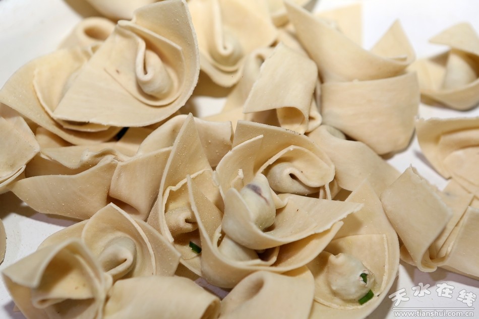 清水扁食历史悠久,由南北朝至唐代时期的“偃月形馄饨”、宋代的“臊肉双下角子”发展而来。在清代史料中记载:“元旦子时年复届初一、无论贫贵富贱,皆以白面做扁食食之,谓之者饽饽举国皆然,无不同也。”随着时代的发展,清水扁食的烹调方式和食材的选择也逐渐融入了当地饮食特色。因烹调方式的不同出现了麻辣扁食、浆水扁食、水煎扁食、清蒸扁食等,因食材的选择不同出现了核桃扁食、麻腐扁食、葵花扁食等,也因为清水当地回民汉民杂居,出现了以大肉为主要汤料的汉族荤扁食,还有以羊肉、韭菜、芹菜为主要汤料的回族清真素扁食,极大地丰富了清水扁食的内涵。