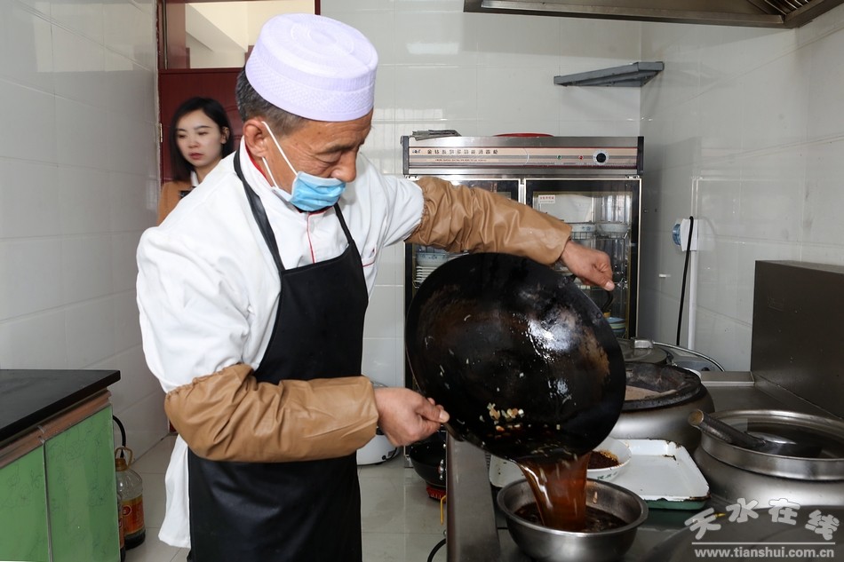 品尝完素扁食的小编对这清水的特色小吃还是很意犹未尽呢,不得接着去尝尝那鼎鼎有名的荤扁食。徒步走进不远处的一家卖荤扁食的餐馆,熙熙攘攘的顾客围满了售票台,餐馆里更是座无虚席。厨师李秀全一边搅拌着早已熬制好的肉臊子汤汁,一边忙着为顾客点餐。小编看到这荤扁食与素扁食最大的区别就是浇在碗里的肉臊子,因为肉臊子需要将猪肉切丁,加水、盐、酱油等各种佐料熬制两个小时才可食用,并且需要在售卖的过程中一直保持煮沸状态。听李师傅说,他们后厨的人每天凌晨4点就开始动工,从包扁食、切肉、熬制臊子汤,再到准备其它食材和佐料,一直到早上六点左右才能准备完毕,这时已经会有人来店里吃扁食,一天的生意也就这样开始了,日复一日,年复一年。