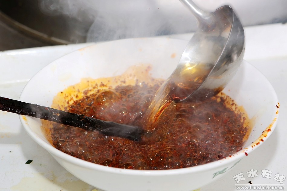 早就忍不住流口水的小编连忙走进了一家专门卖素扁食的餐馆,刚进门,只听见“呲”地一声响,整个餐馆里溢满了油泼辣子的香味。小编好奇地跑到后厨瞧了瞧,看到厨师马文高正在精心准备着吃扁食用的各种佐料。首先就是油泼辣子,马师傅小心翼翼地将已熟透的食用油倒入早已准备好的一大碗辣椒面里,瞬间辣椒的香味四溢,飘满厨房。这时锅里留了少量的熟油,只见他恰好地利用热锅,把切好的一大把葱花扔进锅里,翻炒两三下立马倒进了一大碗醋,两三分钟后不等醋煮开便立即出锅,瞬间,醋的那股醇香扑鼻而来只叫人垂涎欲滴。“这‘炝锅醋’可是我们清水扁食重要的提味佐料之一,把醋加葱花在带有油的热锅里稍煮后,醋的醇香和葱花的辛辣味就会相中和,这时的醋既没有之前那么酸,更会有一种让人舌根回味的浓香。”马师傅一手举着锅,一手拿着大铁勺把炝好的醋一点点倒进了大碗里,还不时为小编普及着清水扁食的美味秘诀。