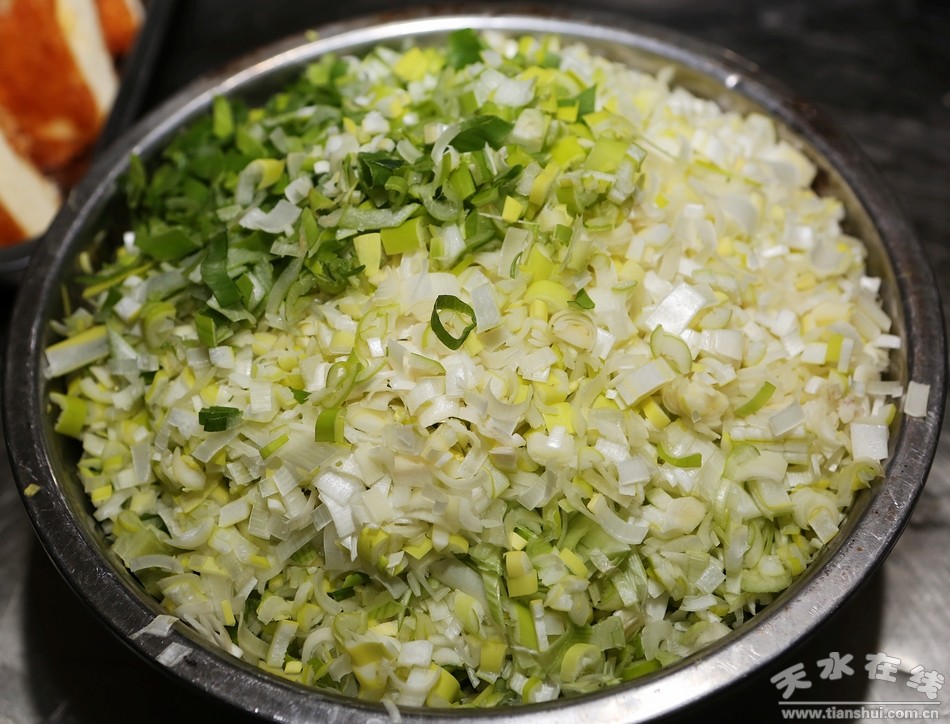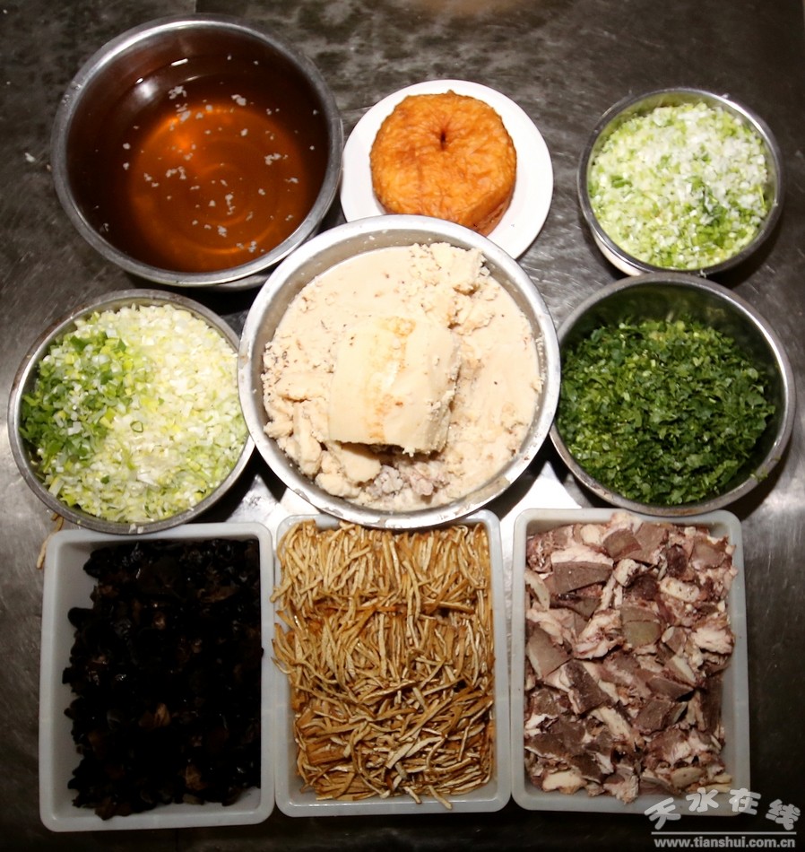一张巨大的菜板上整齐地摆放着十几种食材,应该是专门为烩牛肉准备的。小编仔细看了看,分别都有熟牛肉片,焦黄色的豆腐丝,木耳,牛油,牛肉汤,粉条,葱花,香菜,蒜苗,油香,还有最后一个是调料盒,里面装有盐、鸡精、味精、大香粉等几种佐料。听史师傅说,清水烩牛肉这道菜肴最重要的就是牛肉和牛肉汤,而牛肉汤是用牛肉和牛骨头慢火熬制而成,需要好几个小时,酒店里为了第一时间能让客人享用到这道菜,通常每天早晨会提前煮好牛肉,熬制好牛肉汤,到中午用餐时间就可直接使用。其中搭配汤汁的豆腐则需要先切成片状,在油锅里煎炸之后再切成豆腐丝,色泽焦黄,口感脆嫩,放在烩制好的牛肉汤里也可增加几分美感。而那粉条的爽滑,香菜沁人心脾的香味,牛肉的肉香,再加上豆腐丝的清香,还有那汤汁醇厚的滋味,几种味道叠加在一起,经大火熬煮些许时间,各种美味便淋漓尽致地发挥了出来,这就是著名的清水烩牛肉。还有最值得一提的就是清真食物里颇为有名的油香,它可是清水烩牛肉里必不可少的配食。吃过油香的人都知道,绵软香甜是油香特有的美味。在清水,一碗热腾腾的烩牛肉搭配一块香甜的油香就是这个小县城最独特的风味,就像是美女与野兽,看似毫不搭调,却永远是令人津津乐道,回味无穷的经典。
