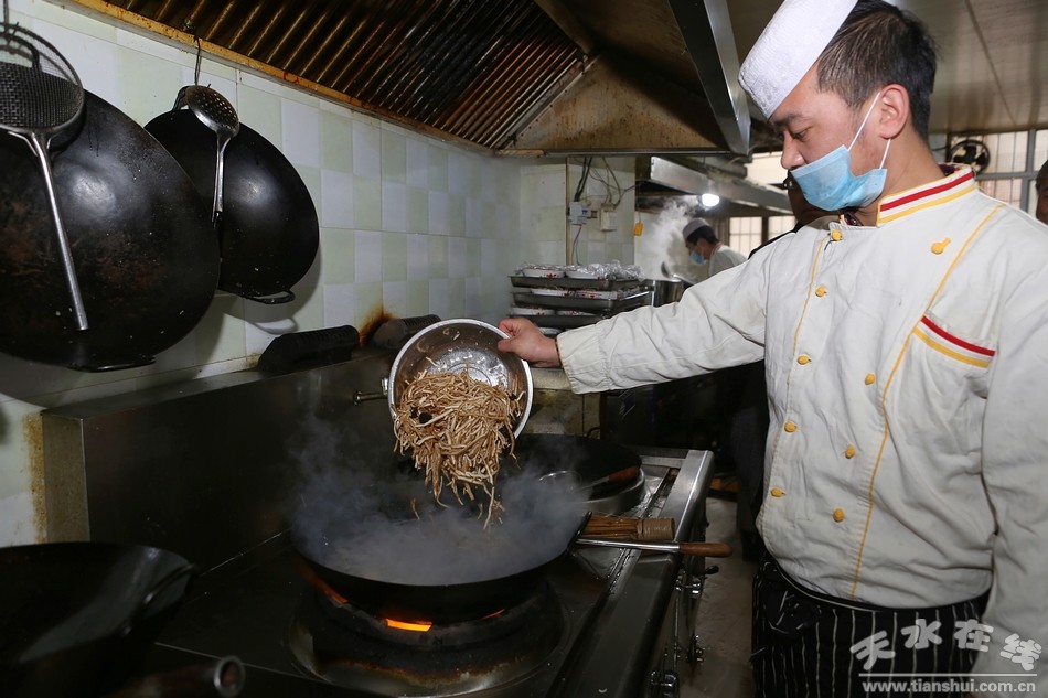 温馨又动人的音乐充盈了整个酒店,新郎新娘喜气洋洋地迎接着前来祝贺的亲人好友,后厨门前人们手忙脚乱,厨师们精心为宴席准备着每一道可口的佳肴,趁着宴席还未开始,小编跑到后厨先来看看著名的清水烩牛肉到底是怎样炼成的。走进厨房,各色各样的美味佳肴琳琅满目,挨个摆在铁盘里只待上桌,厨师史军虎已备置好了烩牛肉所需的所有食材,等到宴席开始其它菜肴享用的差不多的时候,他便开始着手准备烩牛肉的制作,为前来享用宴席的人们送上最后一道美味。可见,不管吃下了多少酒食菜肴,烩牛肉,永远都是清水人餐桌上最重要的主角。