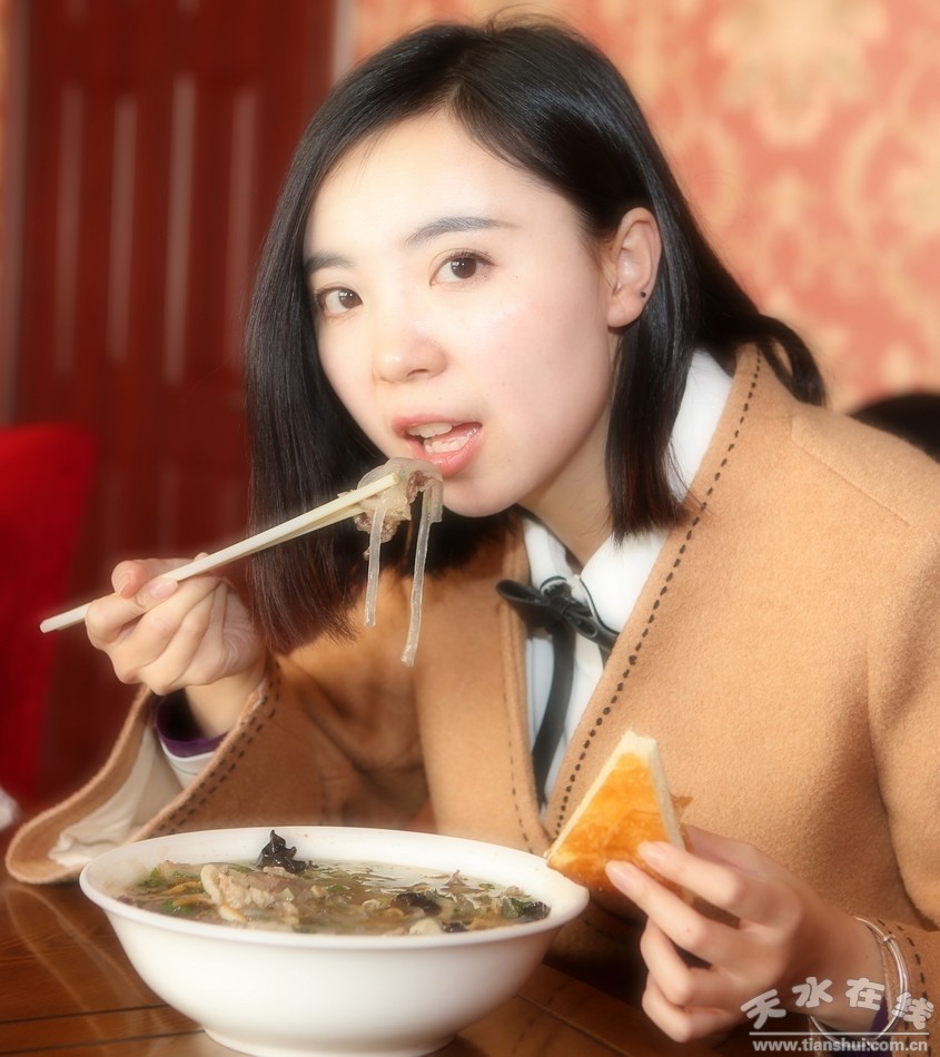 在清水,一碗鲜美的烩牛肉是喜庆的味道,是人情的味道,更是生活的味道。这些味道,已经在漫长的时间和故土、乡情等情感混合在一起,才下舌尖,又上心间。 (备注:在线小编出镜服装由“天使时创”服装店提供。) |