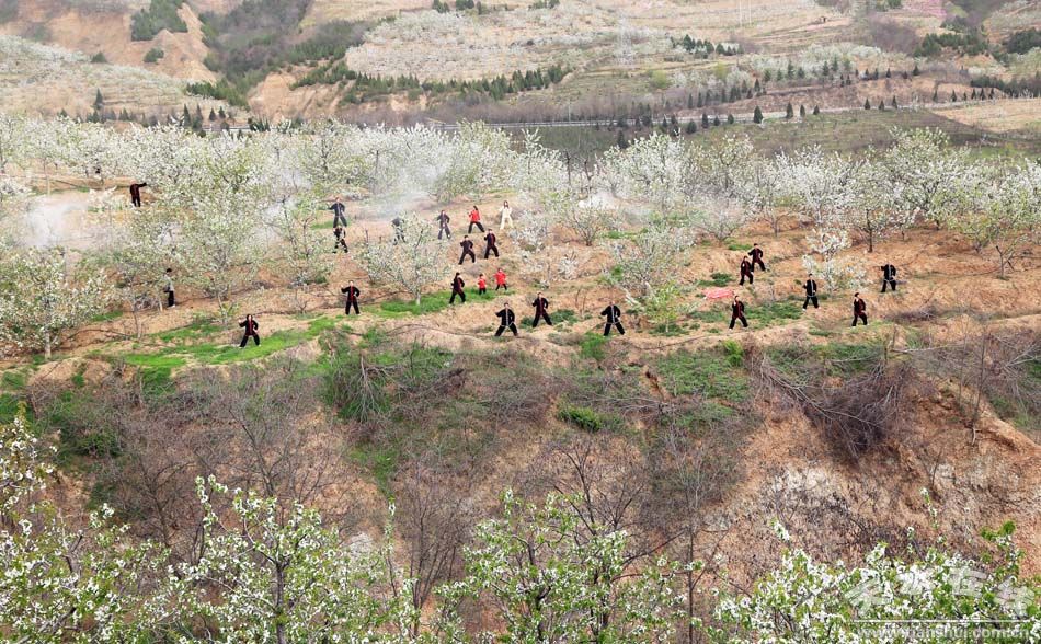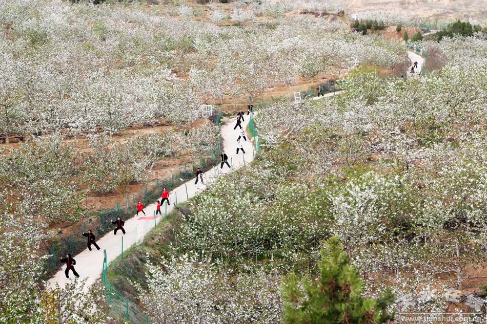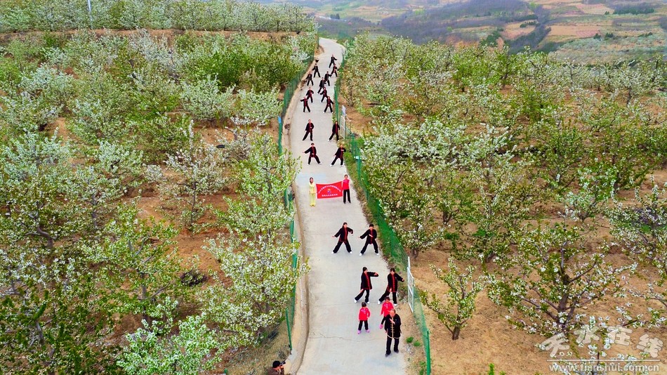 太极不单纯是一种技能、功法,最重要的是一种生活的态度、生活的方式。太极拳含蓄内敛、连绵不断、以柔克刚、急缓相间、行云流水的拳术风格使习练者的意、气、形、神逐渐趋于圆融一体的至高境界,而其对于武德修养的要求也使得习练者在增强体质的同时提高自身素养,提升人与自然、人与社会的融洽与和谐。置身于烟铺的樱桃园中,那青草的清香,樱桃花的芳香,泥土的质朴气息,在这样如梦般的花海中演绎中华太极拳,不仅带给人们一道别样的视觉享受,更能使练太极者领悟到生活的真谛。