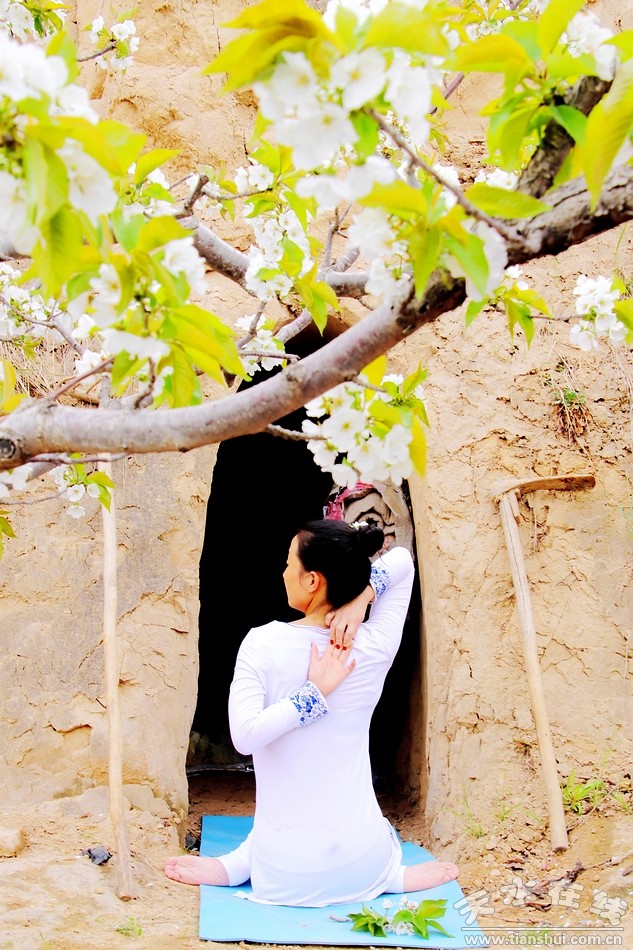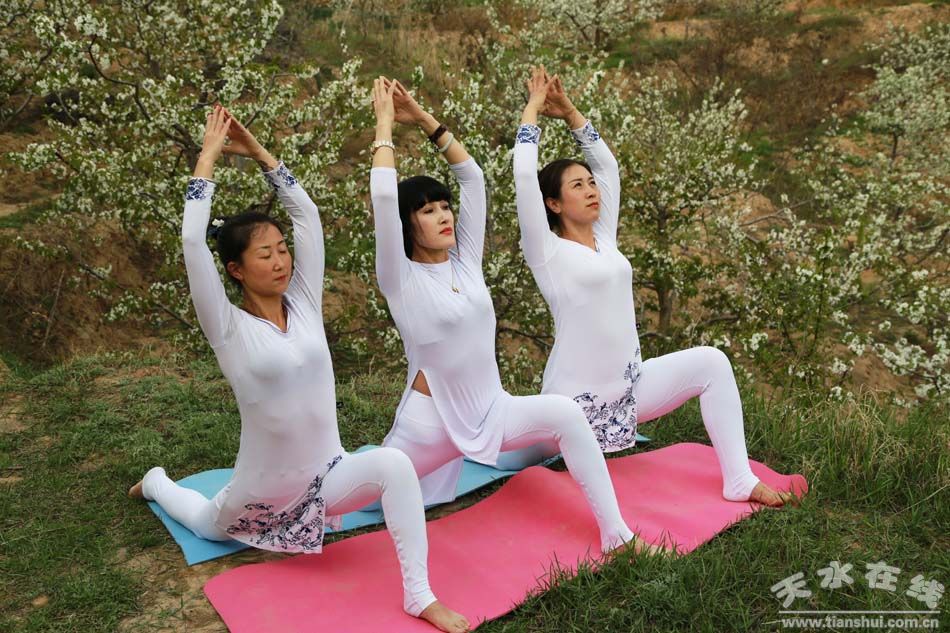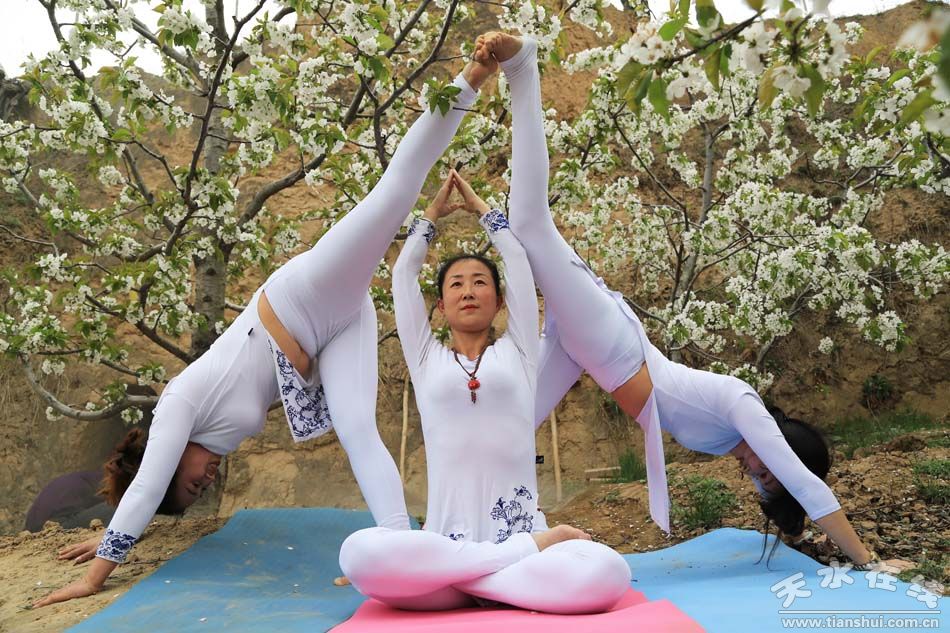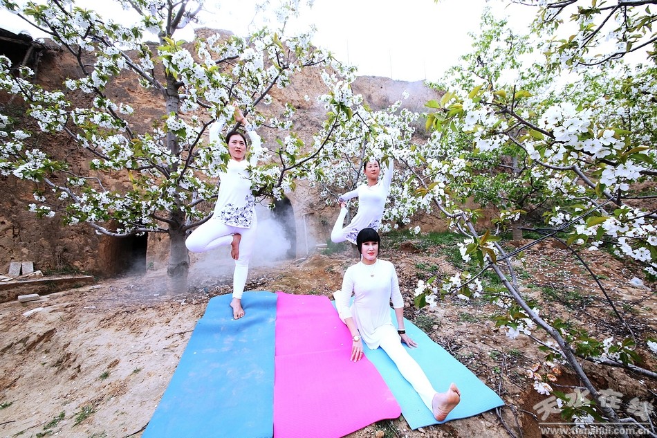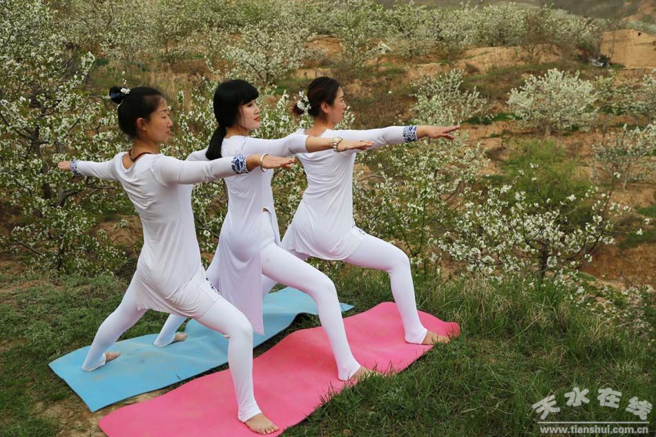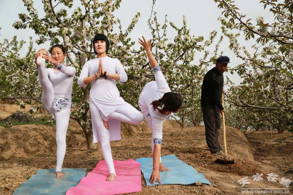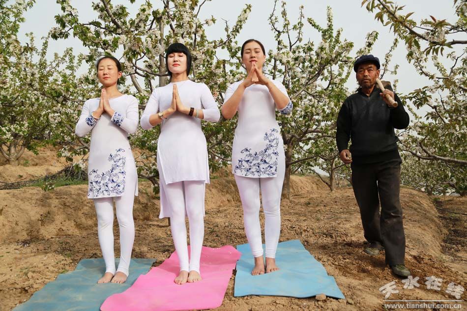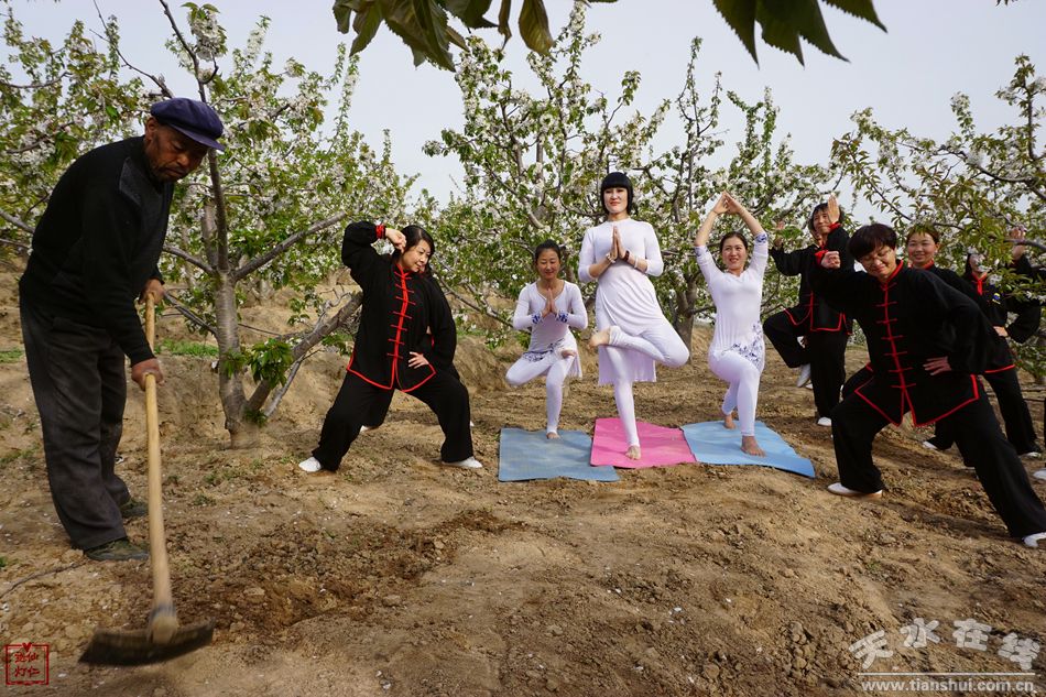春天,是大自然最绚丽多姿的时节,鸟语花香的山间景色与微波粼粼的河流小溪交相辉映,构成了春季独有的气息。四月的春风,轻盈地好似一场梦,轻抚着万物,风儿在空中游荡,与蝴蝶为舞,与花儿做伴。秦州区玉泉镇烟铺村的樱桃园里,阳光明媚,微风荡漾,蝶舞翩跹,风中传递着樱桃花的芬芳,蝶儿循着花香找到了花儿翩翩起舞。4月16日,羲皇太极拳养生馆三十多名学员和莲花空行瑜伽馆的三位老师,也跟随着美丽的蝴蝶,寻觅着樱桃花的芳菲纷纷走进烟铺村,在这如诗如画的樱桃花海中,上演中华传统文化太极拳与柔美的瑜伽相融合的别样景观。不仅将中华太极刚柔并济的魅力挥洒在美丽的樱桃花海中,更是把优雅灵动的瑜伽游刃有余地演绎于繁密的樱桃树下,引来无数游客驻足观看。