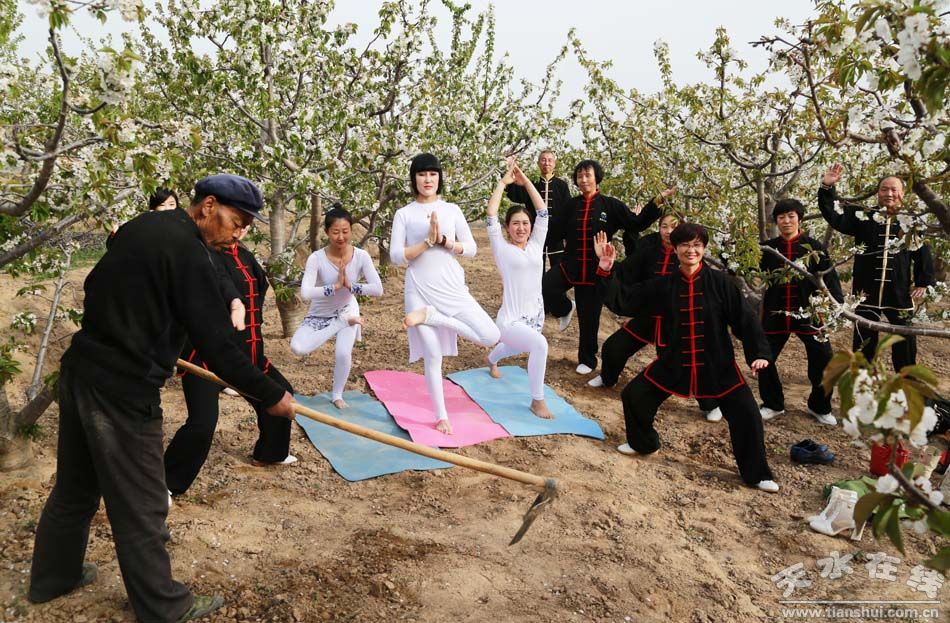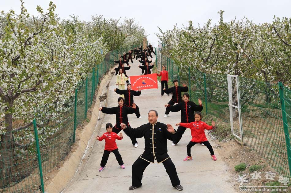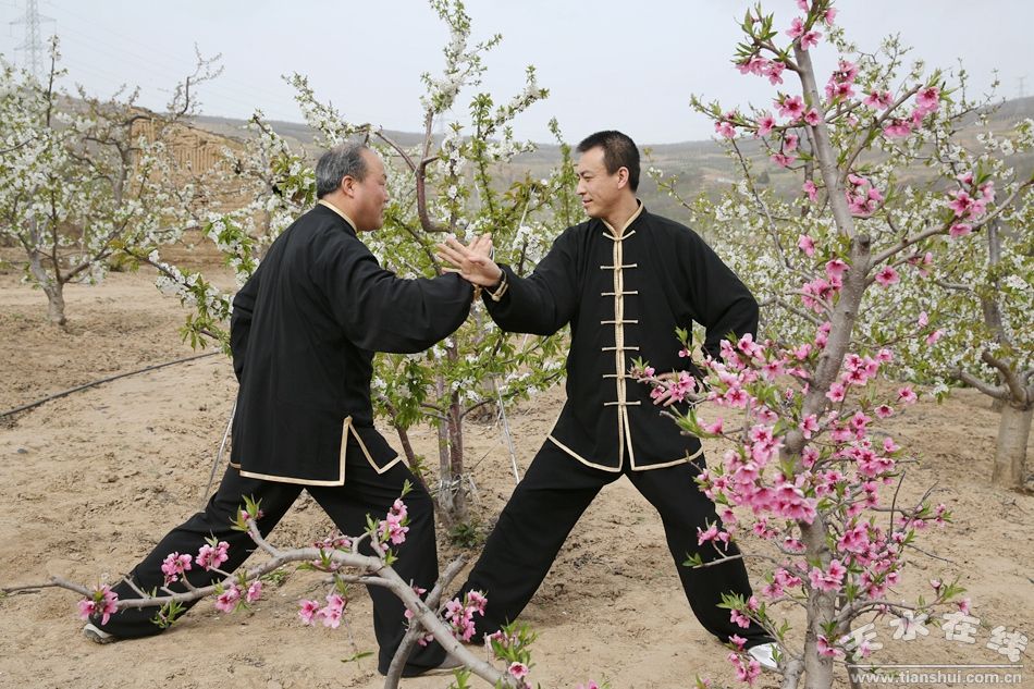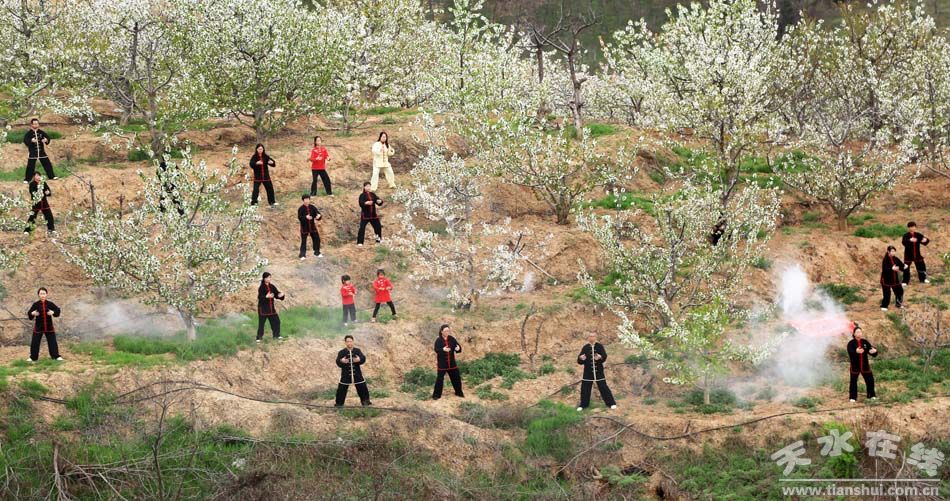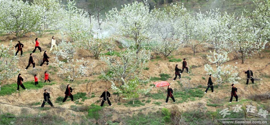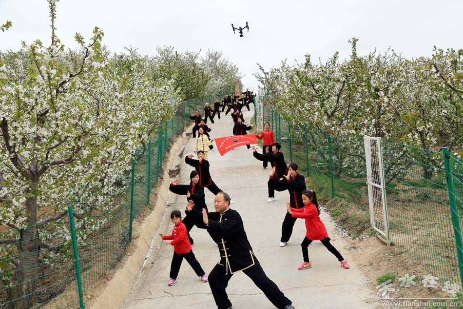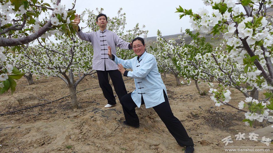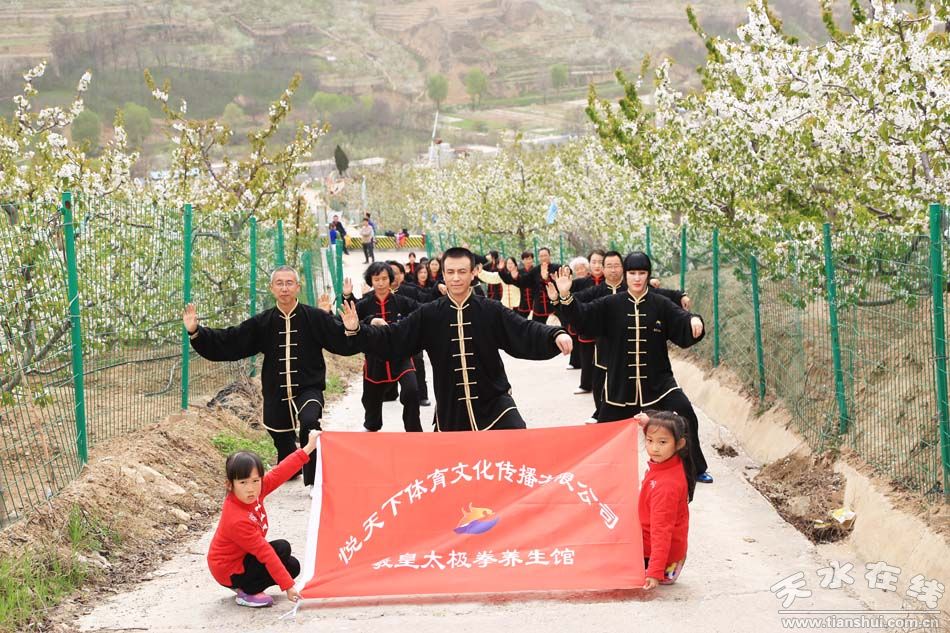 由国家陈式太极拳五段、中国武术家协会会员张继荣和陈正雷,以及太极拳全民推广教练米卫军,在天水共同创办了悦天下体育文化传播有限公司旗下羲皇太极养生馆。该公司秉承“打造健康人生,享受幸福生活”的理念,以自然为本,釆花木之灵气,养浩然健康身。依山之势,循花之径,在烟铺樱桃花海中演绎了一场太极拳“道法自然,逆来顺受,见力化力”的精妙拳法。