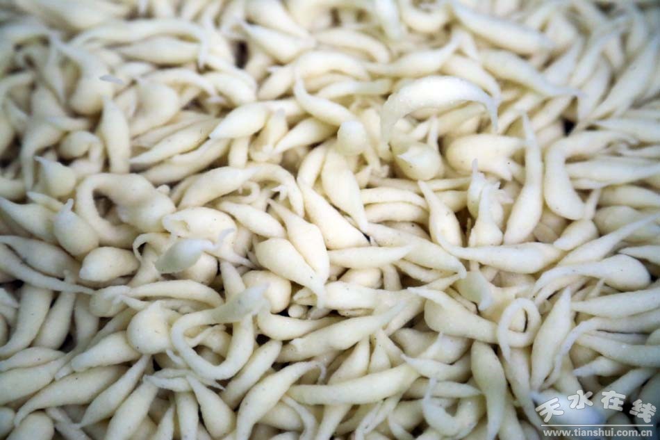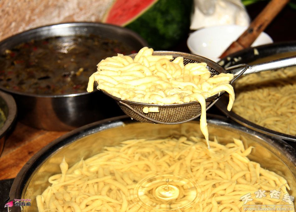 神奇古老的天水,有一种独具特色的面食叫面鱼,大概因其状似可爱机灵的小鱼而得名,其义即是在锅里用面做的小鱼。天水方言读为锅鲰(guō zōu),因形似蝌蚪,故雅呼之。外地人初到天水,见到此种食品,匪夷所思,往往都要一尝为快。其实,锅鲰在天水是极为普遍的食品,无论城乡均受欢迎。一方水土养活一方人,不同的地域风俗民情与饮食文化自然不全相同,所有这些都是民族文化所遗留给后人的宝贵财富,蕴含着历史的精深博大。天水作为人文始祖伏羲的故里,又是久负盛名的历史文化名城,其饮食文化历史悠久,源远流长,影响深远。早年间,锅鲰主要是用番麦(玉米)面粉制作,现在又被聪明的天水人用新的原料代替。锅鲰也可以用荞面、白面、绿豆淀粉为原料来做。番麦面既可以单独做,也可几种面混合做,当然最好吃的是用当年的新番麦面做的锅鲰,新鲜爽口。现在主要是使用番麦淀粉做成的,工艺相对番麦面有较大改进,口感也提升许多。锅鲰口感清爽,风味独特,尤其是在夏月天,当你劳动之余后口干身乏时,吃一碗锅鲰,顿觉身体轻爽,其解乏远比喝茶喝饮料见效快。