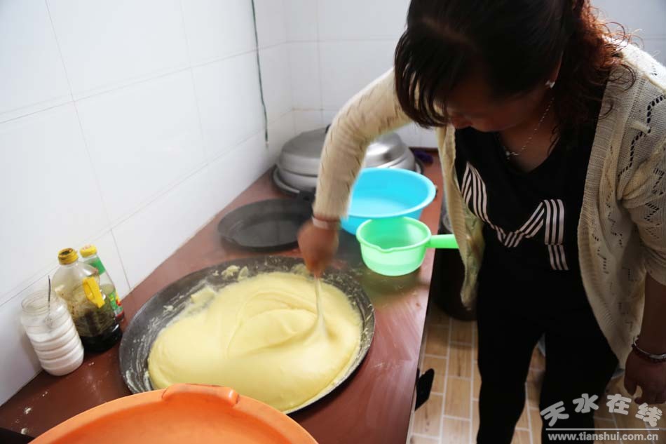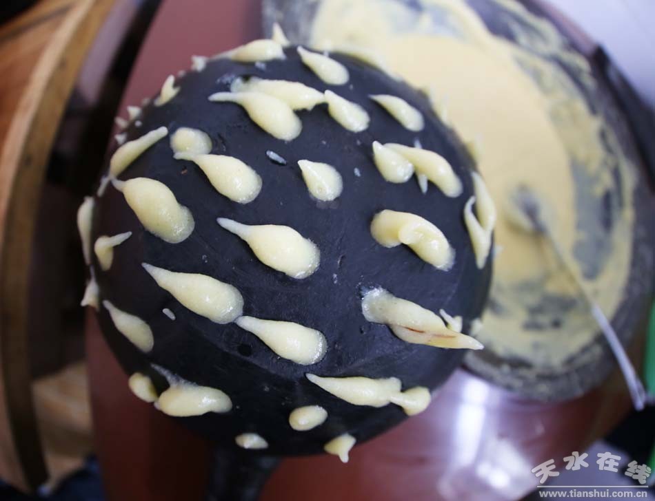 做锅鲰的第一道工序是糁糁饭。糁饭其实原名叫糁面饭,糁饭是其简称,也是天水一种别具风味的小吃。其就是用番麦面在锅里烧成的一种糊状面食。由于面粉遇到热水很容易结成疙瘩,故做这个饭需要一定的技术和经验,才能使糁面饭中没有生面小疙瘩,这样吃起来才滑溜。做糁饭是一门细活,以当年的新鲜番麦磨成的面最香。首先在铁锅里放上适量的水烧开,把事先做好的面糊倒在开水锅里,烧滚后开始撒面,其时右手执一长竹筷或擀面杖,左手抓适量番麦面从手缝里细细的一点一点的将面粉撒入锅里水中,先撒的一把基本熟了再继续往锅里撒,右手要不停的搅动,而且要顺着一个方向搅才行,这时候双手一定要配合默契,要不然面在锅里会结成疙瘩,等面撒到糁饭稀稠均匀的时候,一边用文火慢慢馇着一边还要搅,这时火苗要细小,不宜用大火烧,就这样连续馇一会,搅一次。俗话说:“糁饭若要好,三百六十搅”,多次搅动是做好锅鲰的关健。直到面糊变得筋道,但不能太干,火候一定要掌握适度,否则锅底就会烧糊而形成面夹生,这一过程全靠手腕用力。此时看到核桃般大的气泡从锅里“扑哧扑哧”地往出冒,再用大勺来回搅动并盖上锅盖,用细火慢熬少许时间,糁饭用木勺舀起来感觉有柔劲、韧劲、香味四溢的时候即可,一锅伴着新鲜蕃麦面特殊香味的糁饭便好了。待糁饭在锅里似浆糊状坚柔滑道颜色透亮时取一种网孔状的陶制漏勺(俗称锅鲰马勺),“锅鲰马勺”是专门为“滴锅鲰”而制作的底部有很多小孔的陶制马勺,系秦安县的工匠精心烧制而成的生活餐用器具,以当地的稍带红色的黄土为原料,用经过精心拌制而成的泥做成勺状泥坯,在底部加50多个小孔,然后在土窑里烧制而成,买回来后还需要用开水烫煮,并需重新打磨处理光滑。用铁勺将糁饭舀到锅鲰马勺里面,下接一盆凉水,顺势用力挤压糁饭从漏孔漏下就会断为一节一节的短节,大小均匀,于是一条条洁白如玉、光滑细长的“小鱼”便从马勺小孔中游出,滴入盛有凉水的盆里。其形状似蝌蚪(俗称舀舀勺),也像小鱼苗,故有叫面鱼的。此过程俗称“滴锅鲰”。其间,锅鲰堆积时要用筷子在清水中拨动一下,防止热锅鲰结在一起。随后,为了使锅鲰尽快定型,还得经三、四次换水冷却后即成锅鲰。