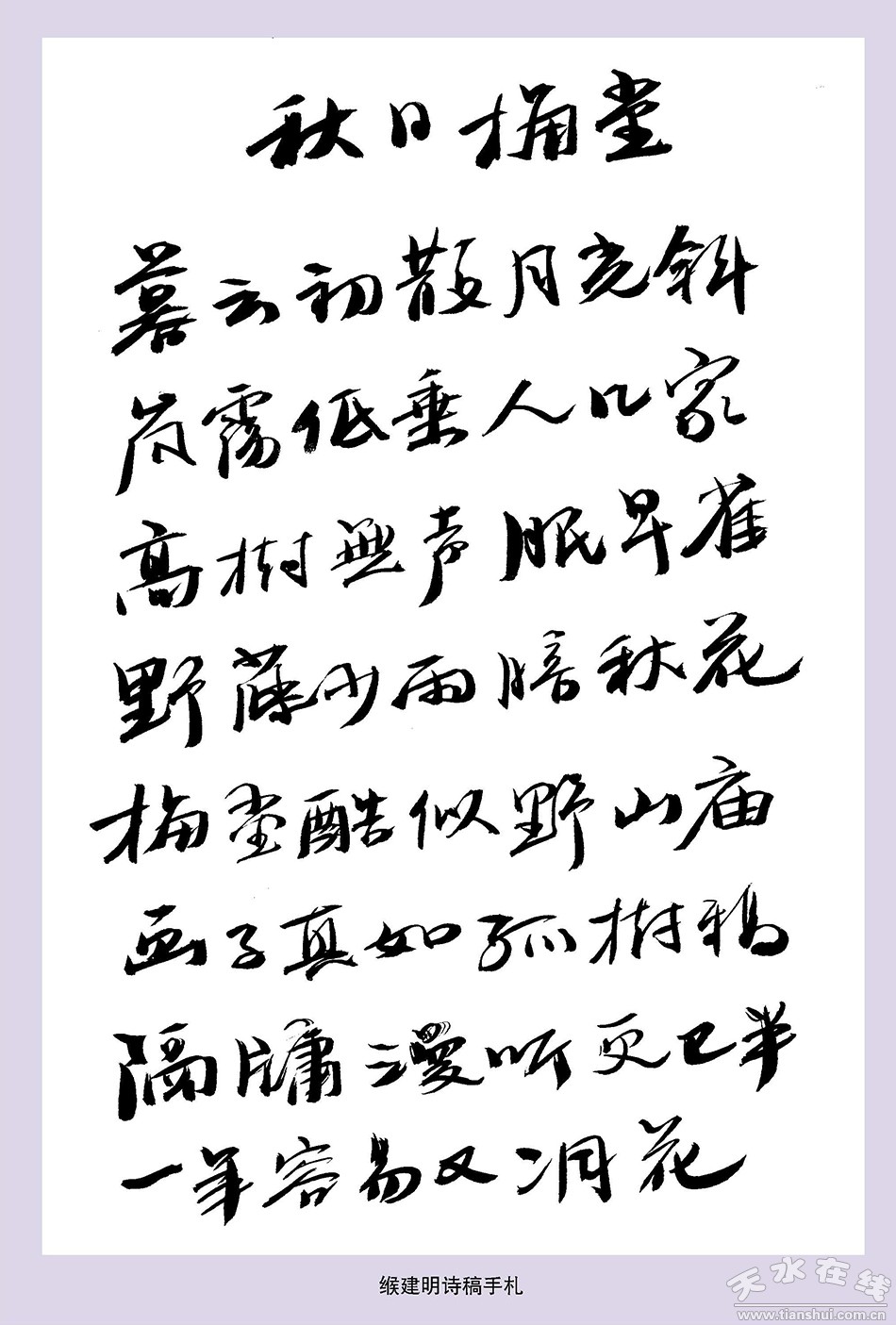 缑建明是诗、文、书、画全面修养的艺术家,工于山水、人物、花鸟,深入研习魏晋、宋、元、明、清诸家,是近现代人物画、山水画、花鸟画中传承创新有所建树的画家之一。他推崇诗、书、画一体,注重画外修养,吸收古今长处,讲求笔情墨韵,构图守白留黑,创造出时代感的新意境。他将精通的人物、山水、花鸟、书法的技法互为通融,使画作更具表现力。画风潇洒灵秀,线条飘逸、挺劲、大气,出神入化,表现物像惟妙惟肖。