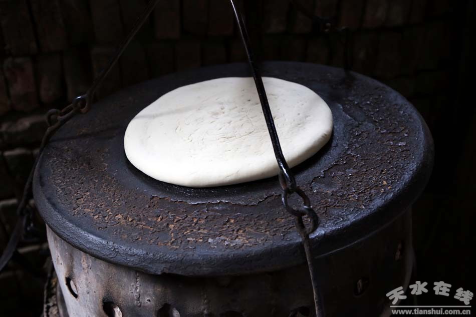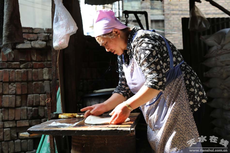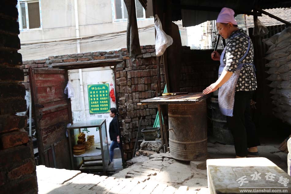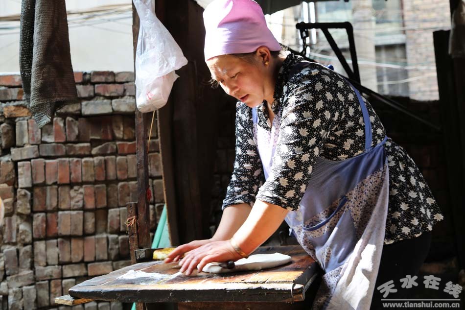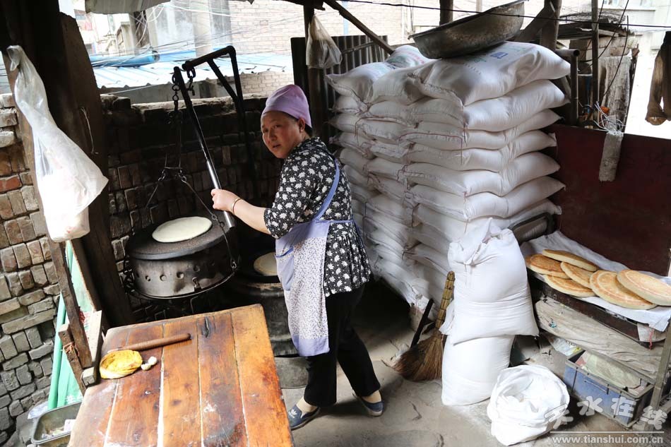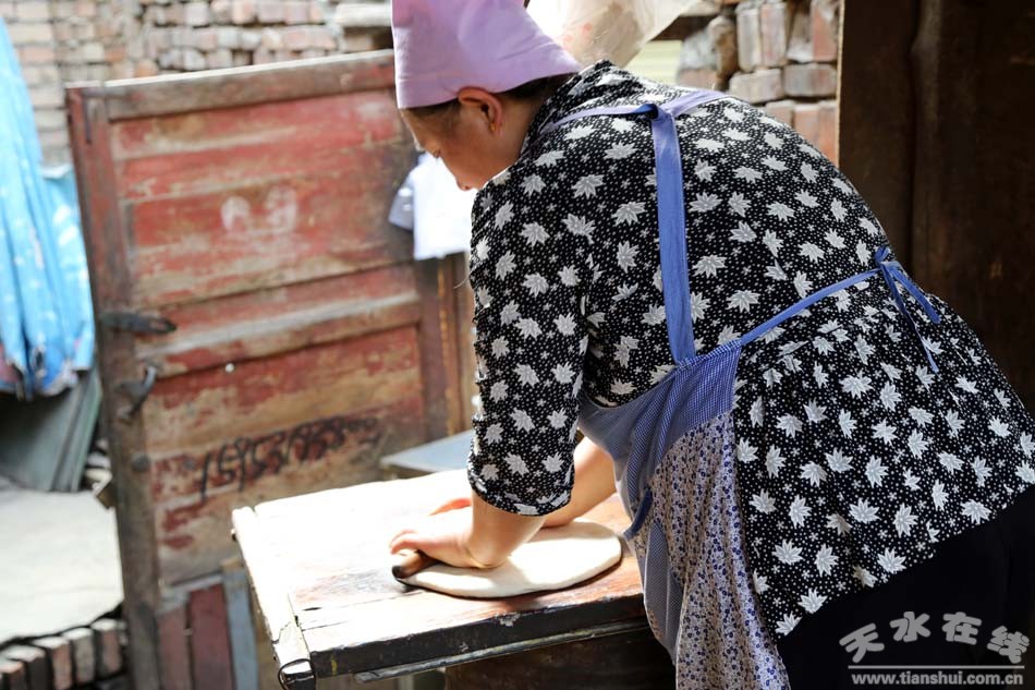 踏着青石板径直前行,走到巷子中段,一股醇醇的麦香吸引了小编我。古老的院落里,女主人刚从锅里取出一个热腾腾的锅盔放进门口的小玻璃框里,既为 “展示品”,又是准备售卖的“热馍馍”。看到我们来访,她可是更加高兴地展示着做锅盔的好手艺。女主人两手塞进面团里使劲地揉搓着,还不时观察着锅里的馍馍熟到了几分好掌握时间,同时她还得操心着门口的生意,路过巷子的行人时不时就会来买她家的馍馍。不一会,又一锅酥油饼出锅,金黄醇香,看着就美味诱人。不仅这些,她家还有“牛舌头”馍、国云烤馍……甜味的、咸味的、原味的,应有尽有,只待顾客选择。从早上七八点到晚上八九点,这位女主人就这样,一边揉面,一边掌握火候,一边又操心生意,几乎是一心三用,十几年如一日,和她的家人在这条古老的巷子里做着平凡的生意,过着安逸的生活。