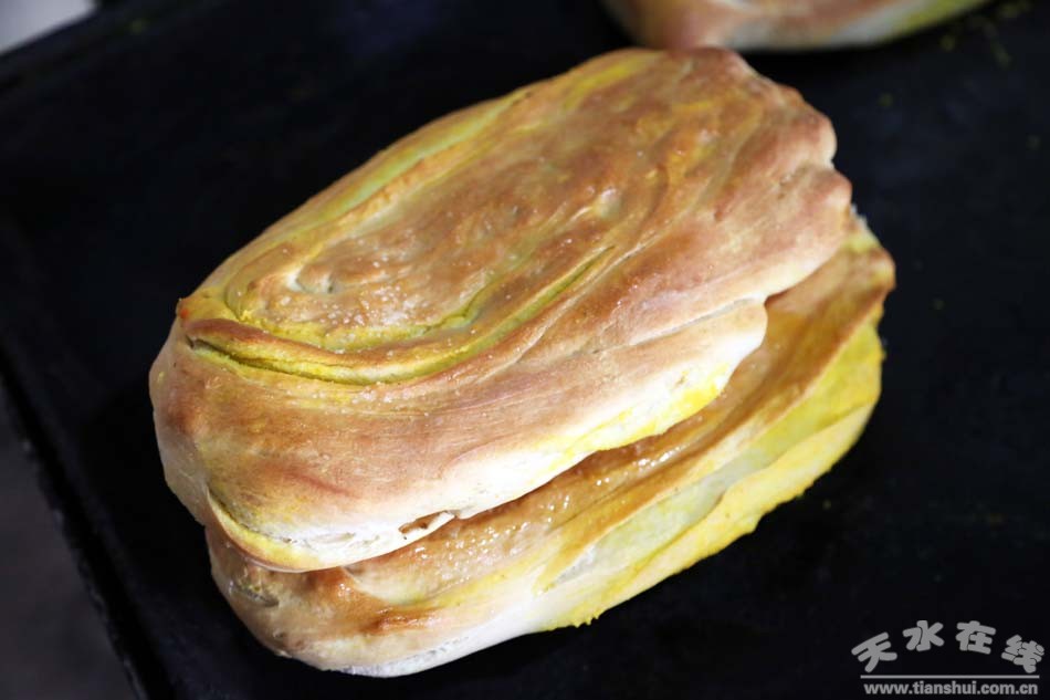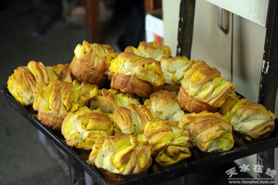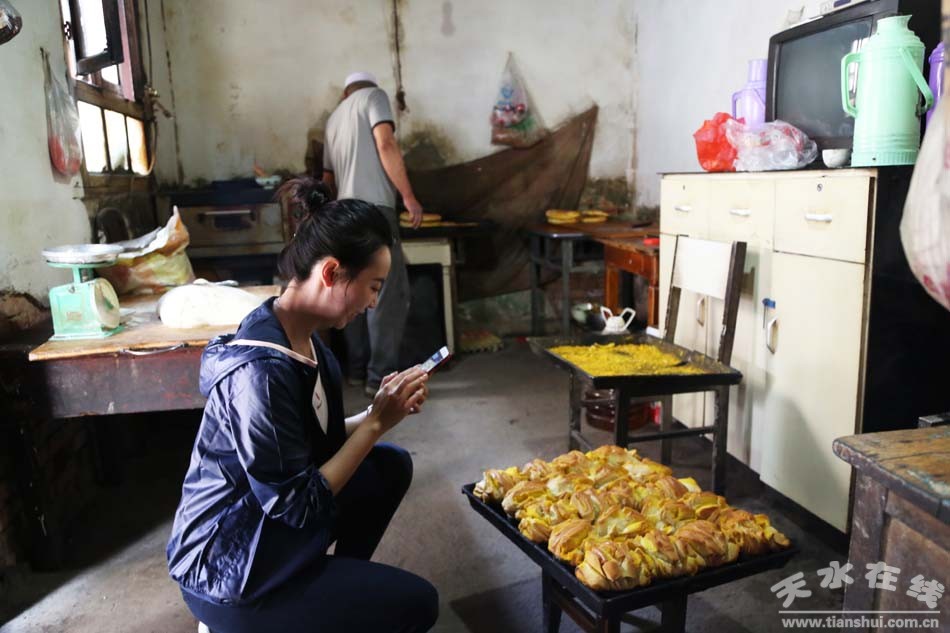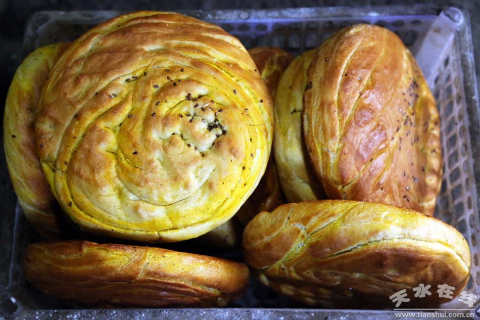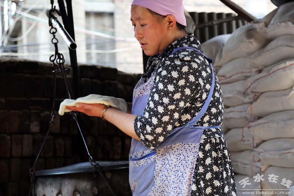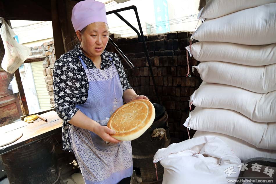 踏着青石板径直前行,走到巷子中段,一股醇醇的麦香吸引了小编我。古老的院落里,女主人刚从锅里取出一个热腾腾的锅盔放进门口的小玻璃框里,既为 “展示品”,又是准备售卖的“热馍馍”。看到我们来访,她可是更加高兴地展示着做锅盔的好手艺。女主人两手塞进面团里使劲地揉搓着,还不时观察着锅里的馍馍熟到了几分好掌握时间,同时她还得操心着门口的生意,路过巷子的行人时不时就会来买她家的馍馍。不一会,又一锅酥油饼出锅,金黄醇香,看着就美味诱人。不仅这些,她家还有“牛舌头”馍、国云烤馍……甜味的、咸味的、原味的,应有尽有,只待顾客选择。从早上七八点到晚上八九点,这位女主人就这样,一边揉面,一边掌握火候,一边又操心生意,几乎是一心三用,十几年如一日,和她的家人在这条古老的巷子里做着平凡的生意,过着安逸的生活。