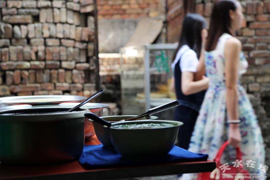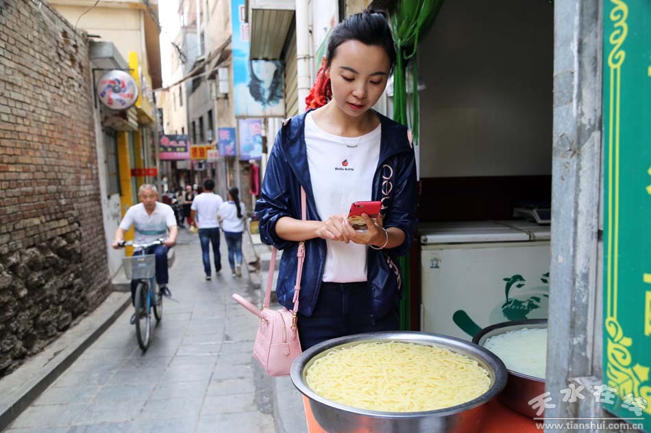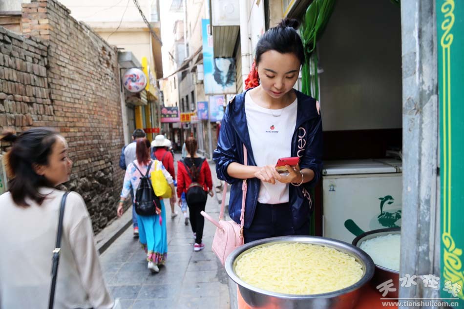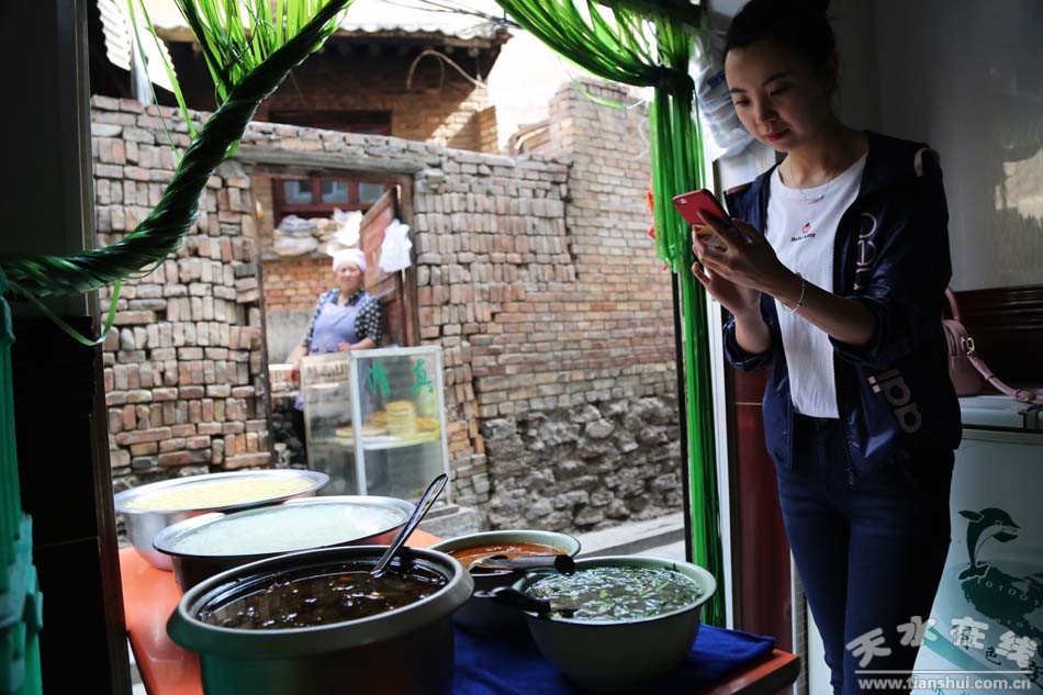 她家正对面的邻居也是一家卖天水特色小吃的本土生意人,不过卖的不是各式花样的馍馍,而是天水人一到夏天就想来一碗的天水“锅鯫”,俗称面鱼。一大盆玉米面做的黄色面鱼,和一大盆淀粉做的白色面鱼,整齐地摆在店门口的方桌上,刚炝好的浆水不时飘来一股酸爽的清香,还有那用土豆、胡萝卜加西红柿烩制的汤汁更是满屋飘香。仿佛只用这些最淳朴的美味来诱惑路经后寨巷的人们,就会让他们不得不前来品尝一口天水的特色小吃。