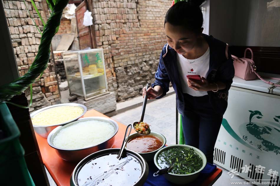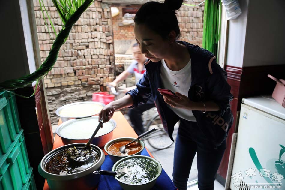 店老板吴毅告诉小编,他和妻子魏杏妹都是土生土长的天水人,在这条古巷里做生意也很多年了,每天一大清早做面鱼是他俩的“必修课”。八点左右,人们开始上班上学,来来往往,妻子便准备着炝浆水,炒韭菜,烩制土豆番茄汤。他则主要负责照看生意,根据顾客的要求,给他们调制浆水面鱼或者番茄汤汁面鱼。新鲜爽口的面鱼配以酸爽的浆水,或者搭配香醇的汤汁,看着顾客吃的可口,吃的开心,就是他俩最大的心愿。